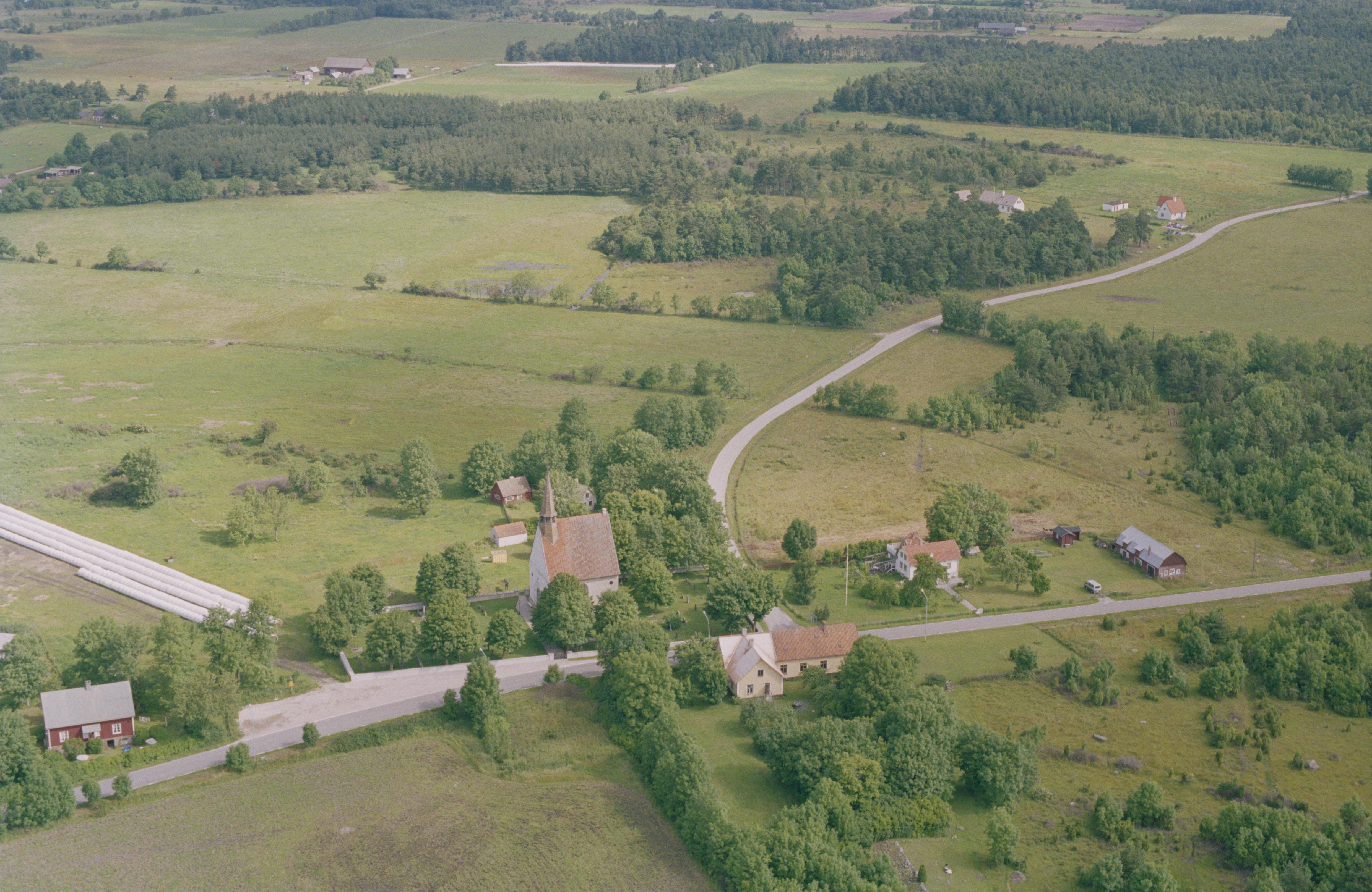 Beskrivning: Västergarns kyrka RAÄnr Västergarn 125 under bildens mitt. (Bilden tillhör även Riksintresse-nr I23 - Paviken - Västergarn.) Bilden är tagen mot (väderstreck): NNO