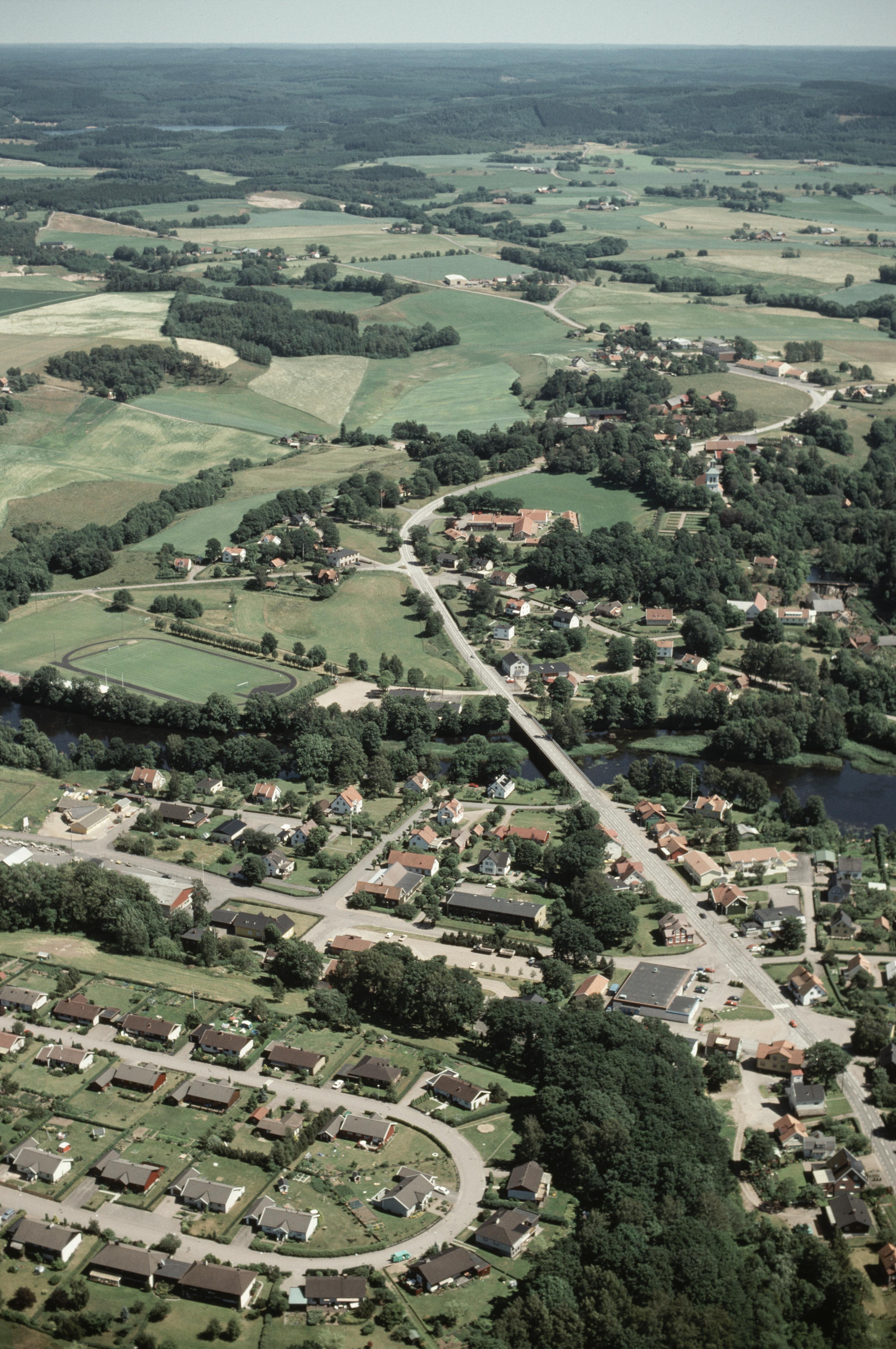 Beskrivning: Ätradalen. Ån Ätran markerar gränsen mellan socknen Alfshög och Vessige (i bildens övre del). Till höger om bildens mitt Vessige kyrka i Vessige socken. Bilden är tagen mot (väderstreck): Ö