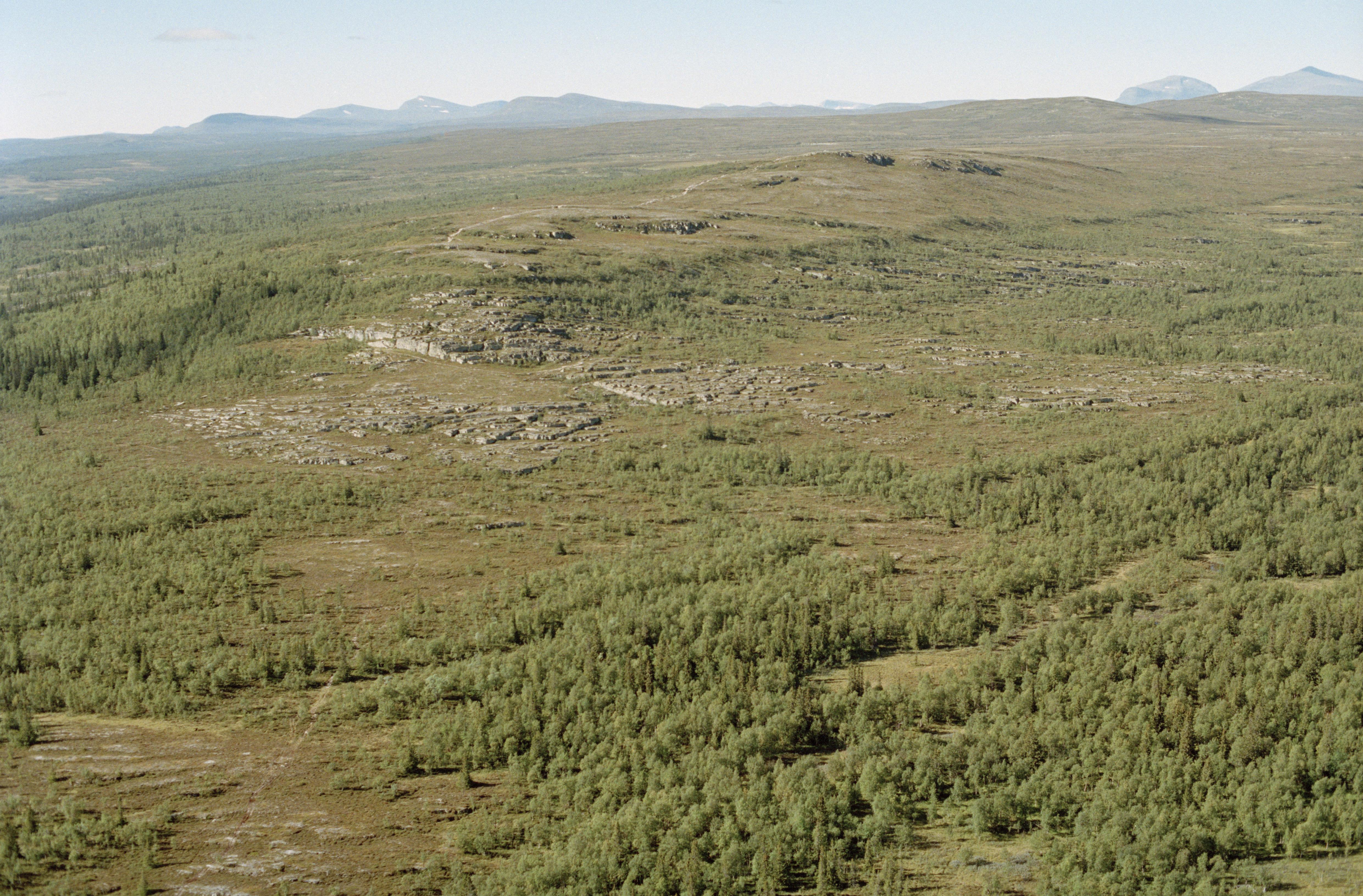 Beskrivning: Östra delen av lågfjället Flatruet (Fleete) vid bergstoppen Ruändan (Sjnjaptjegietije). I bergsidan till vänster över bildens mitt en lodrätt klippvägg med hällmålningar RAÄnr Tännäs 58:1. Bilden är tagen mot (väderstreck): V