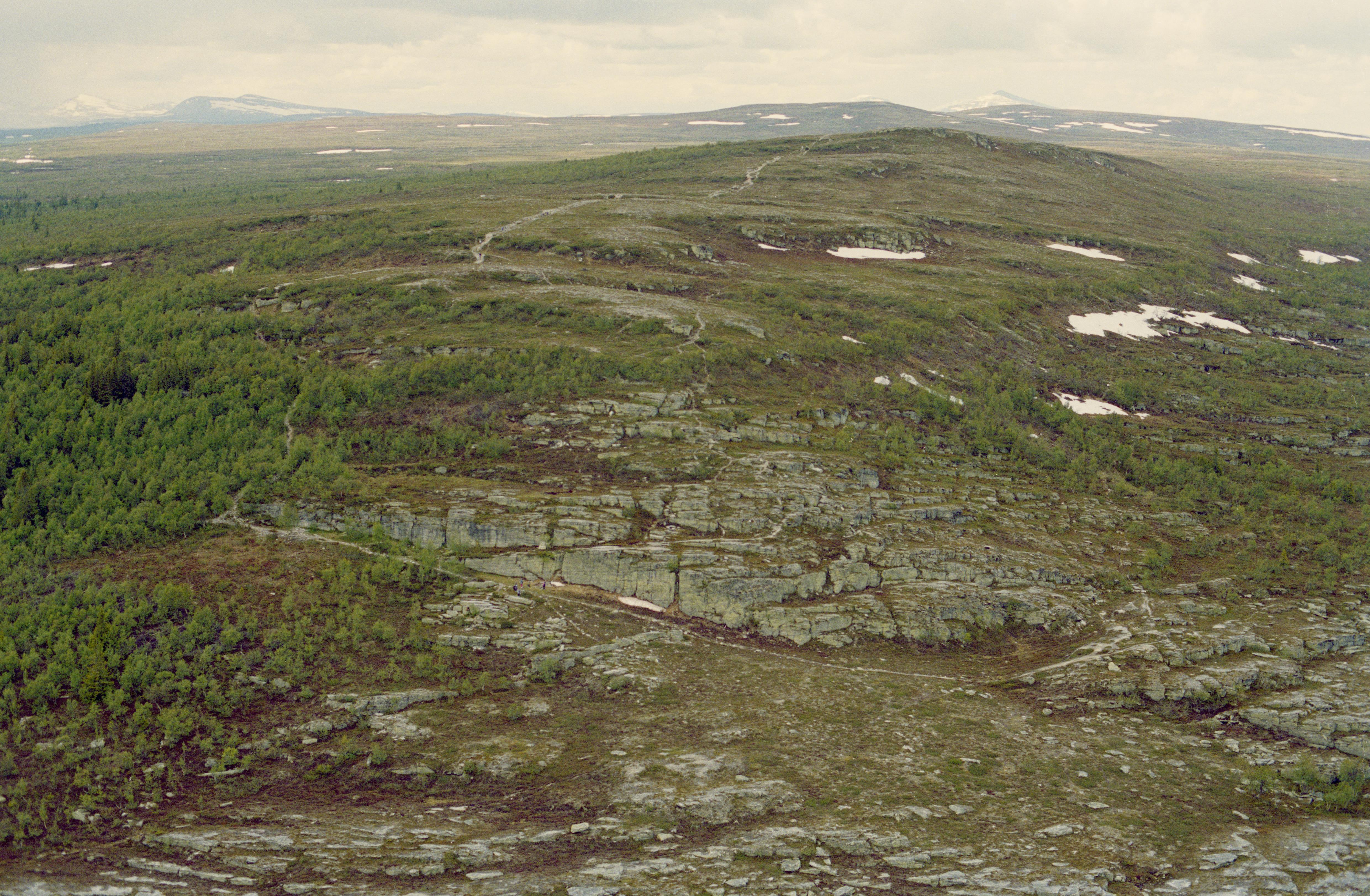 Beskrivning: Östra delen av lågfjället Flatruet (Fleete) vid bergstoppen Ruändan (Sjnjaptjegietije). I bergsidan under bildens mitt en lodrätt klippvägg med hällmålningar RAÄnr Tännäs 58:1. Bilden är tagen mot (väderstreck): NV