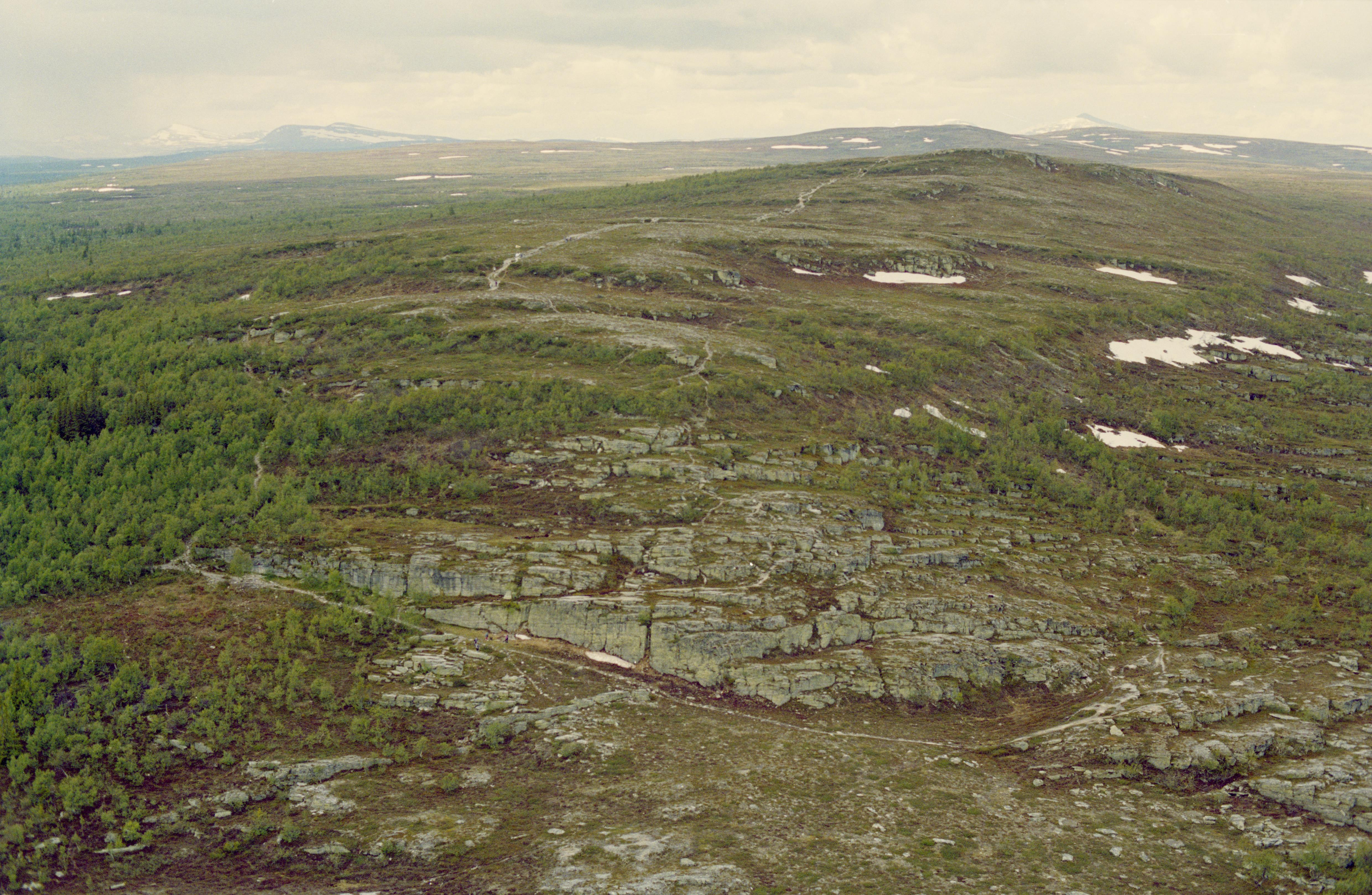 Beskrivning: Östra delen av lågfjället Flatruet (Fleete) vid bergstoppen Ruändan (Sjnjaptjegietije). I bergsidan under bildens mitt en lodrätt klippvägg med hällmålningar RAÄnr Tännäs 58:1. Bilden är tagen mot (väderstreck): NV