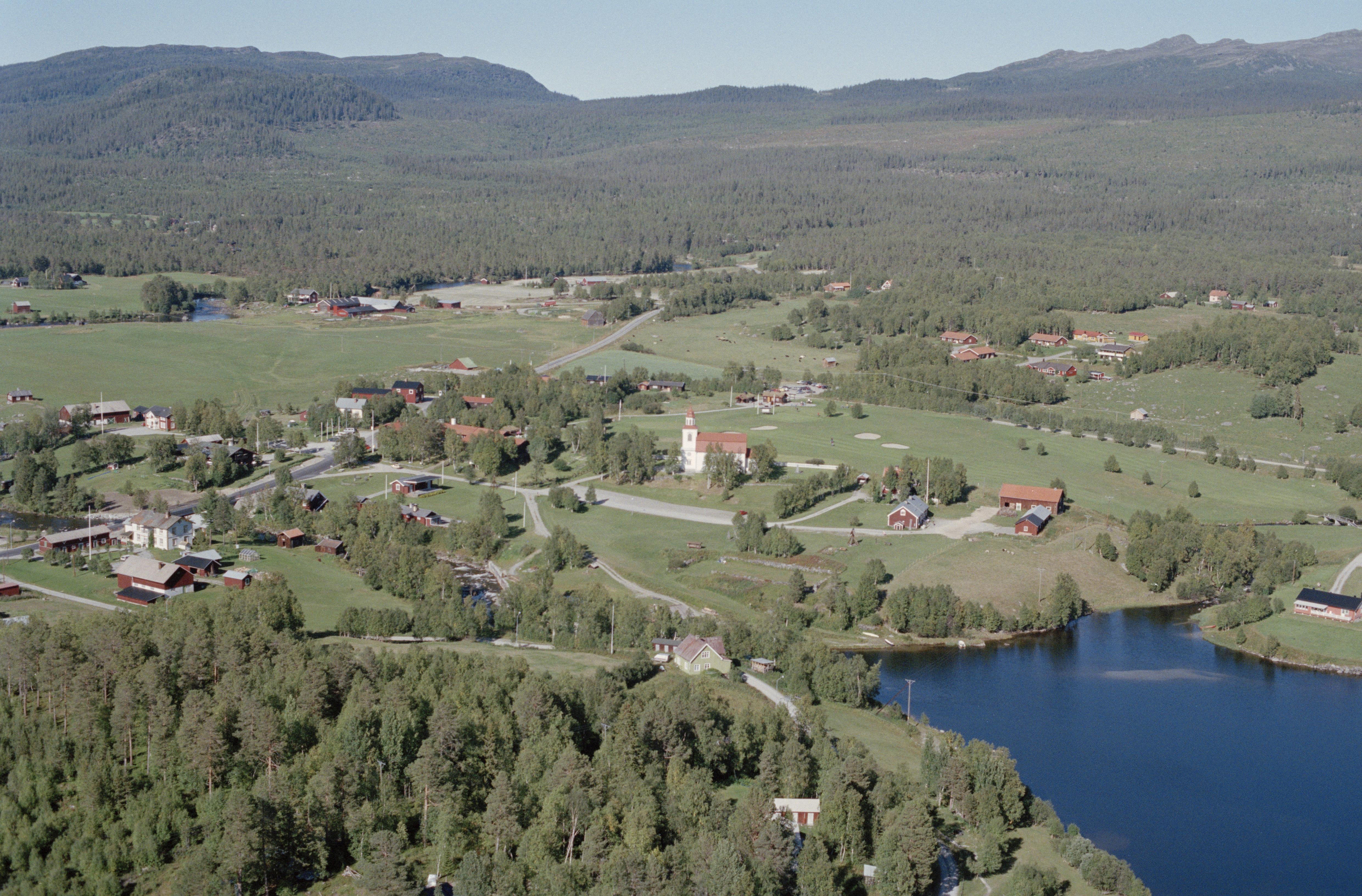Beskrivning: Ljusnedals kyrkby vid älven Ljusnans mynning vid Ljusnedalssjön. Vid mitt hyttområde RAÄnr Tännäs 254:1 och Ljusnedals kyrka. Bilden är tagen mot (väderstreck): N