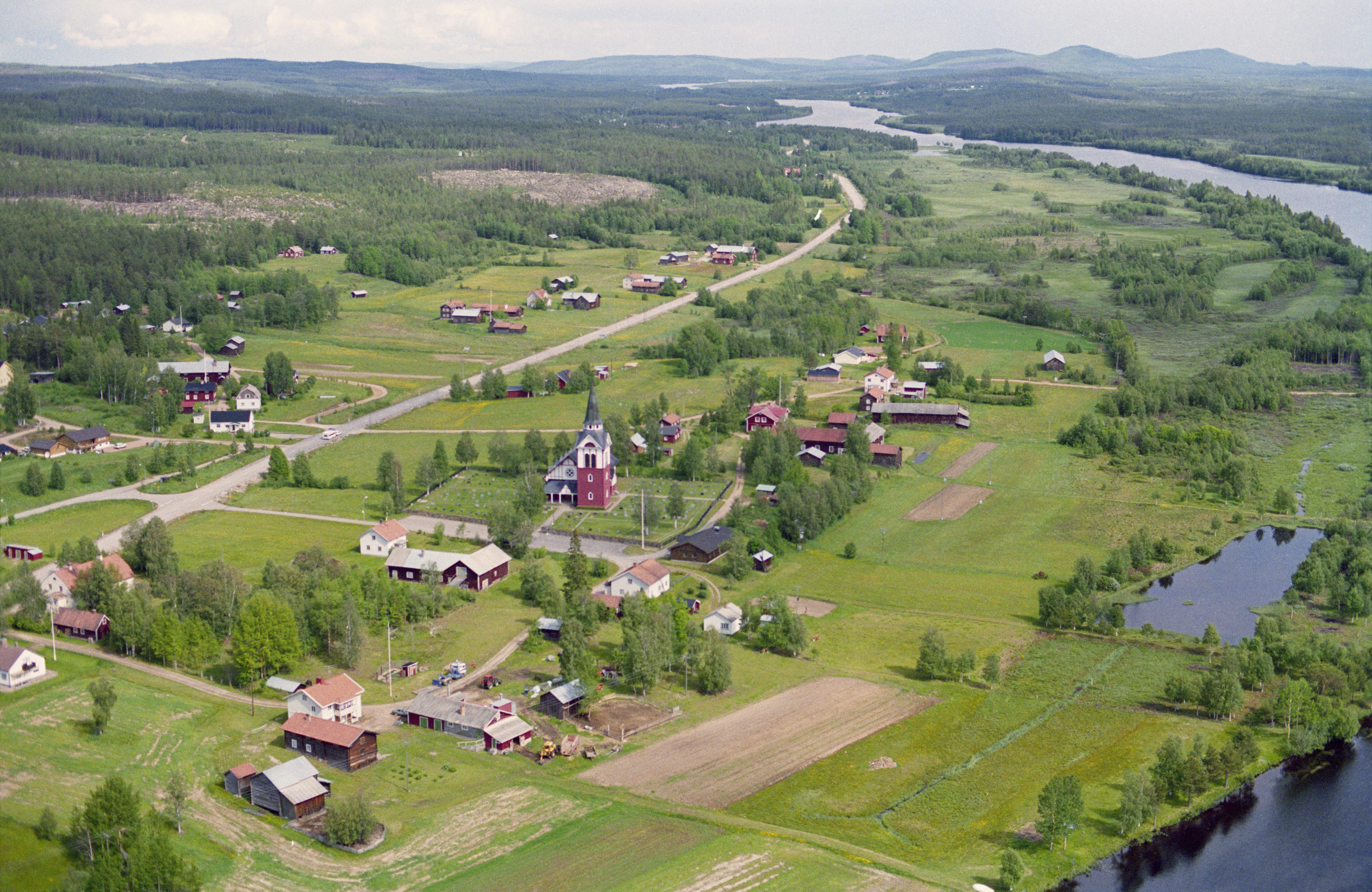 Beskrivning: Älven Ljusnan vid Älvros kyrkby. Älvros nya kyrka (Älvros kyrka) i bildens mitt. I byn bytomt RAÄnr Älvros 464, 483, 465, 474, 484, 545 m.fl. Bilden är tagen mot (väderstreck): Ö