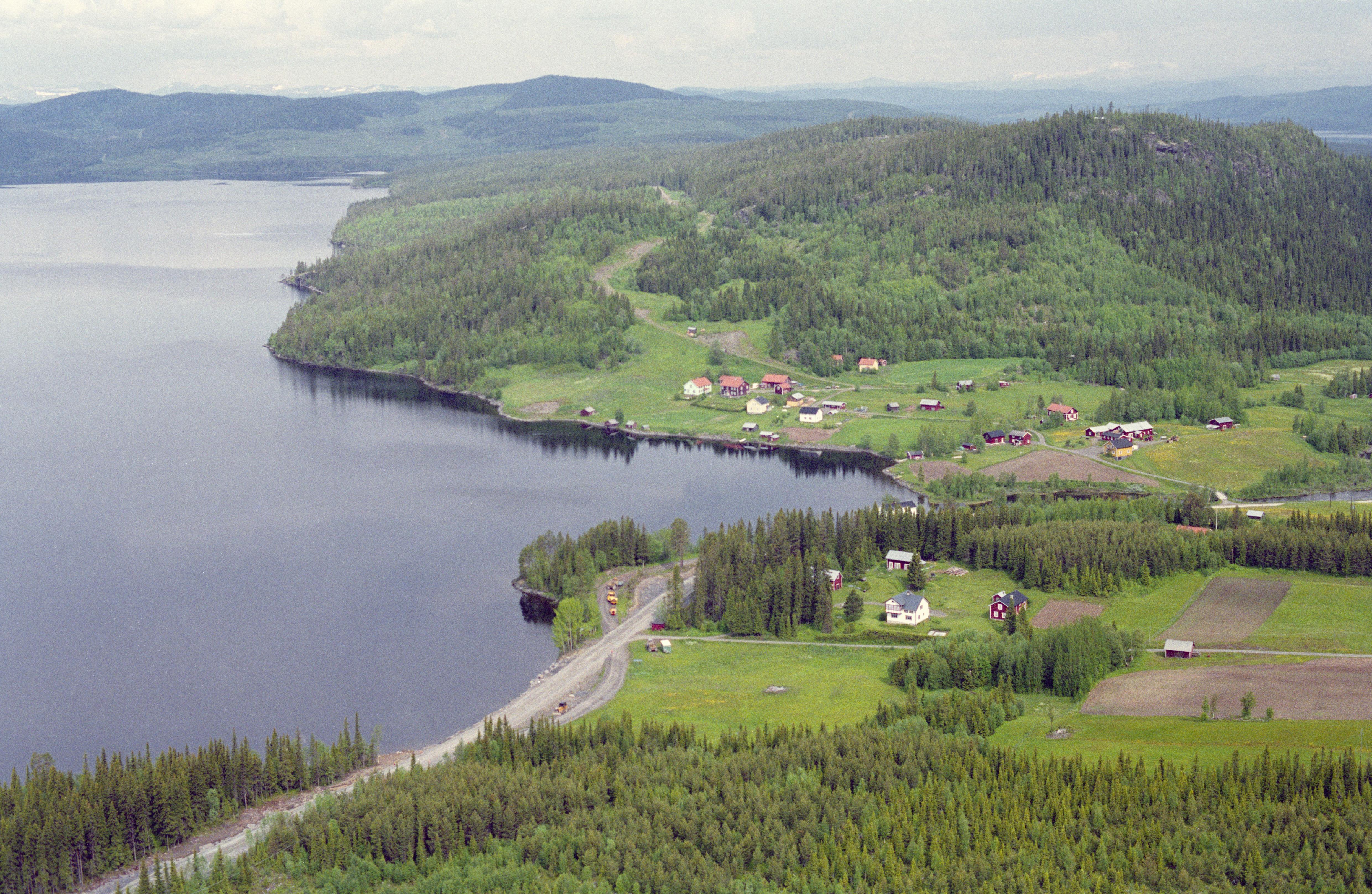 Beskrivning: Skärvångssjön vid Norra Skärvångens by. Vid bildens mitt boplats RAÄnr Föllinge 180:1 m.fl. Uppe till höger Nordsjöberget och till vänster områden med hällmålningar vid sjöns strand. Bilden är tagen mot (väderstreck): NV