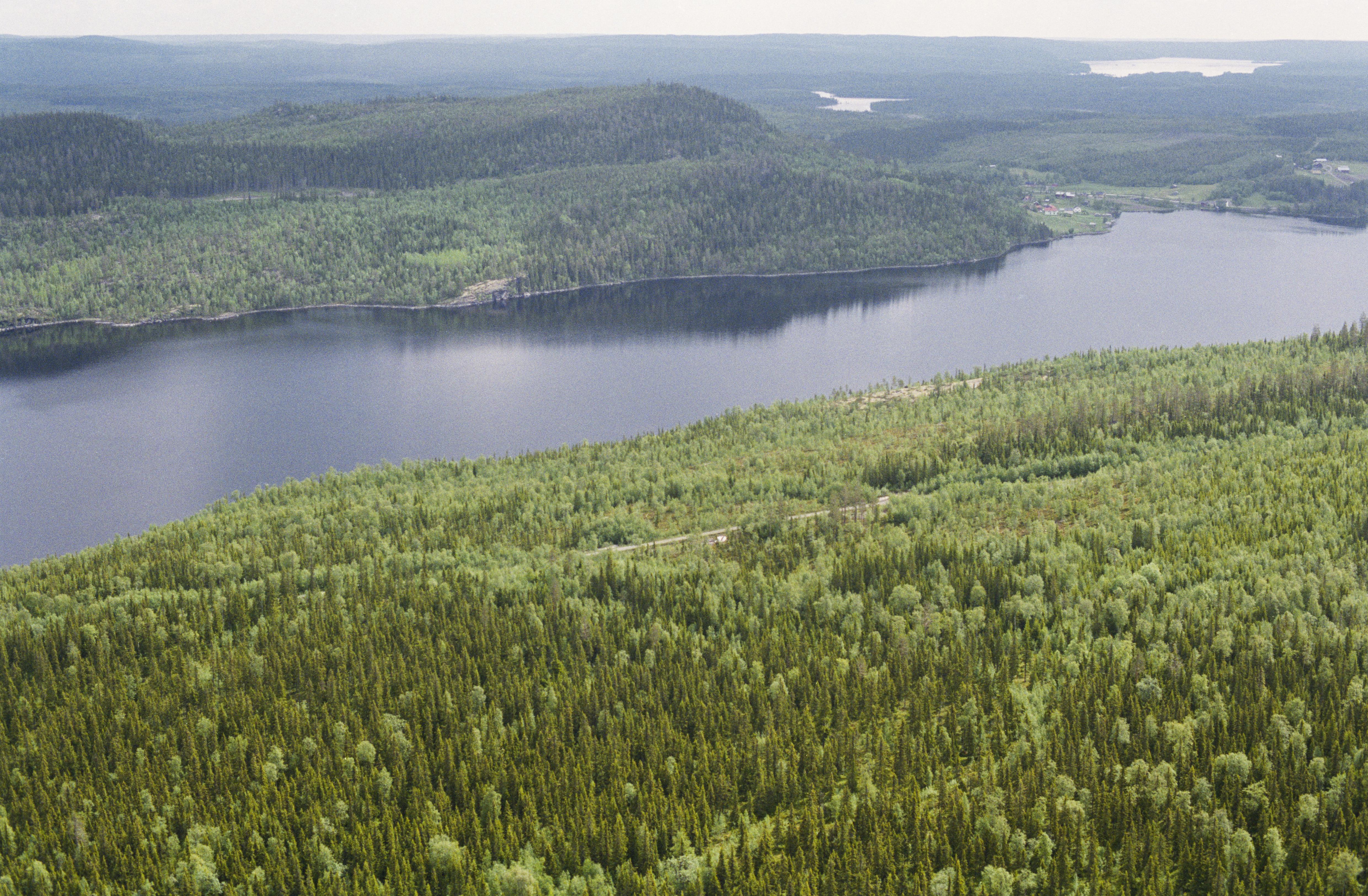 Beskrivning: I bildens nedre del Rensberget vid Skärvångssjön. I bildens övre del Nordsjöberget, norrväst om byn Norra Skärvången. Till vänster över bildens mitt hällmålningar vid Hällberget RAÄnr Föllinge 1:1, boplats Föllinge 175:1 och hällmålning vid Brattberget Föllinge 346:1. Bilden är tagen mot (väderstreck): Ö
