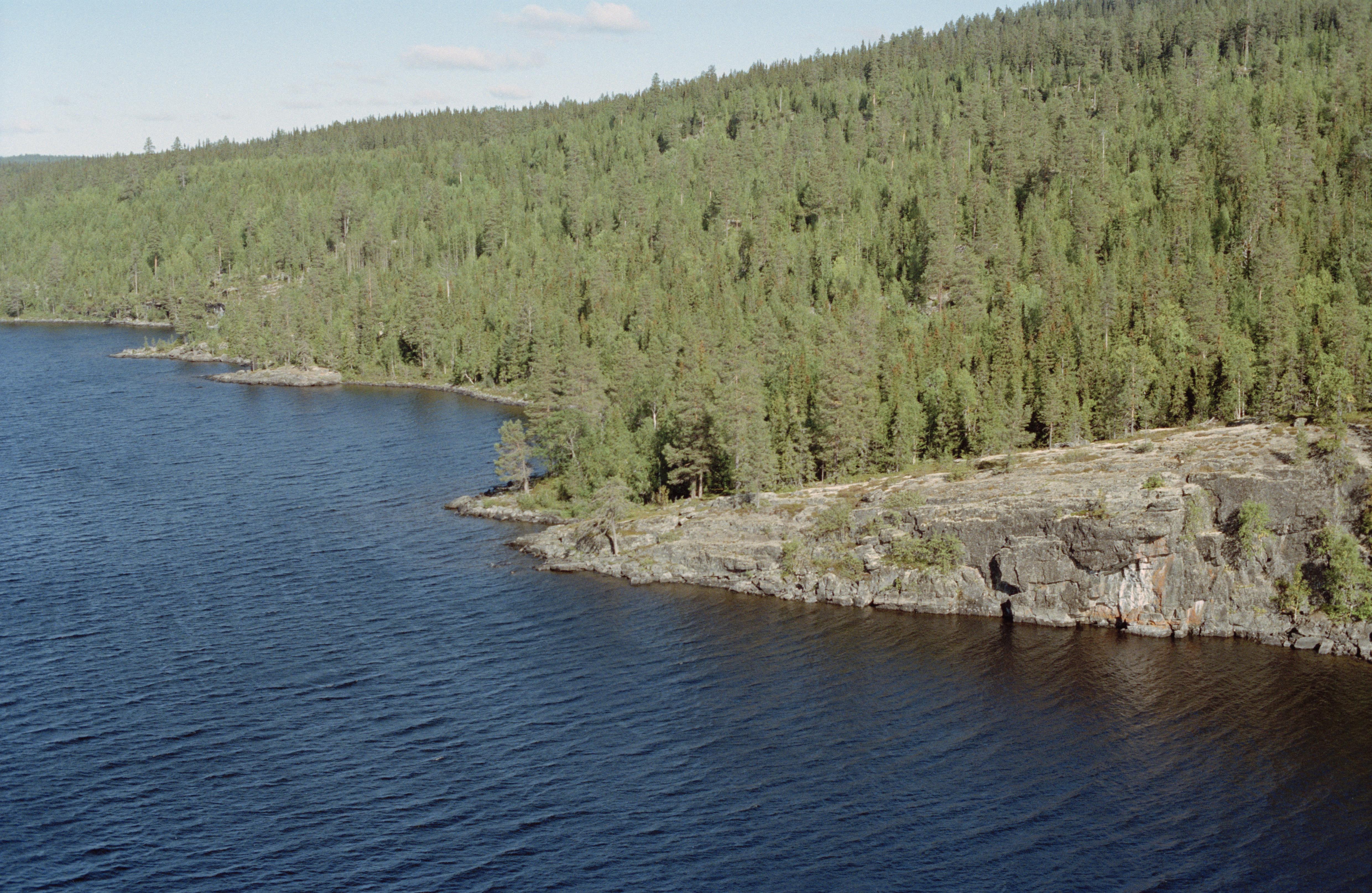 Beskrivning: Skärvångssjön norrväst om Norra Skärvångens by. Vid bildens mitt Brattberget med hällmålning RAÄnr Föllinge 346:1. Över bildens mitt hällmålning RAÄnr Föllinge 346:1 vid Hällberget och boplats Föllinge 175:1. Bilden är tagen mot (väderstreck): N