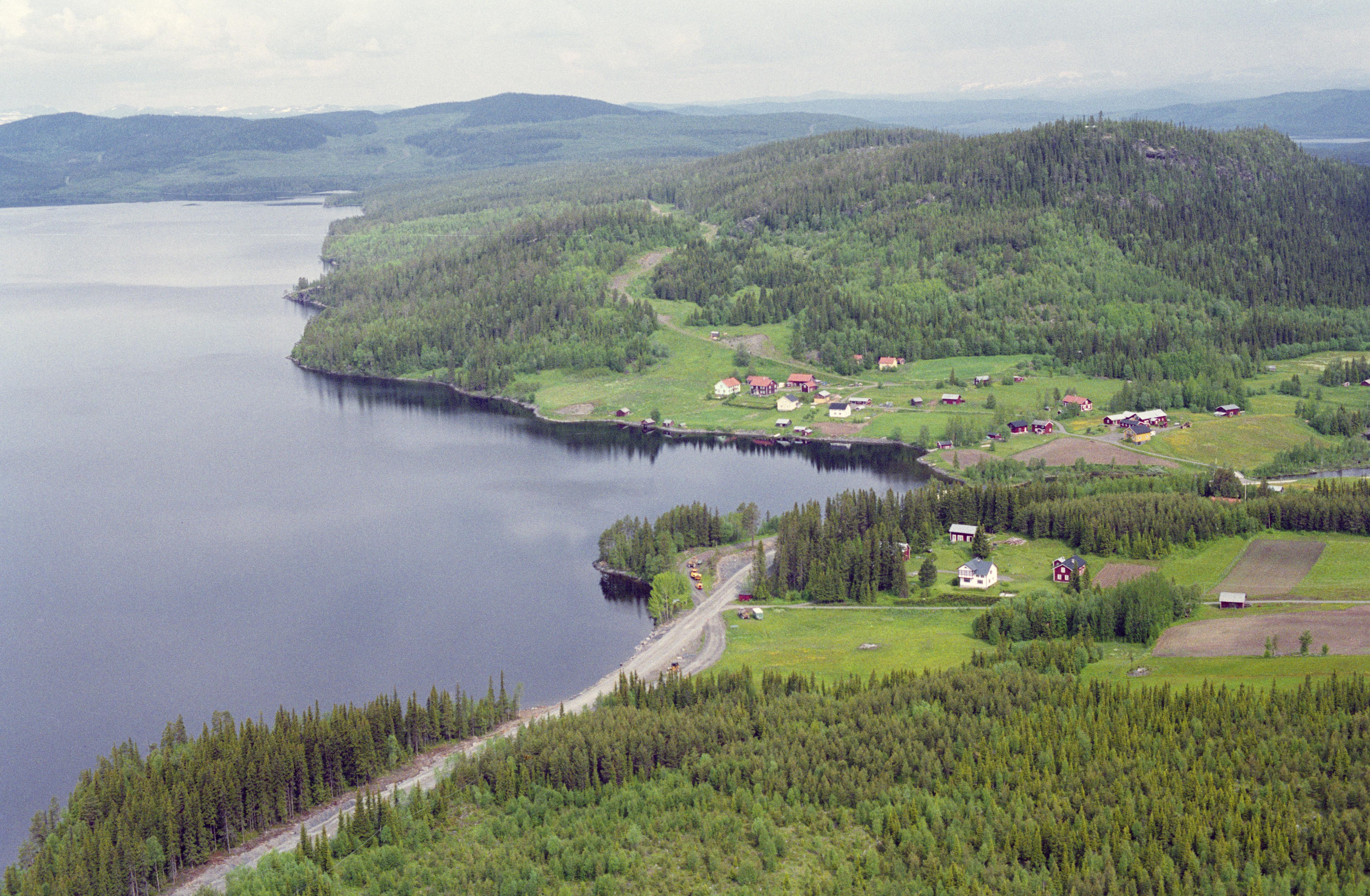 Beskrivning: Skärvångssjön vid Norra Skärvångens by. Vid bildens mitt boplats RAÄnr Föllinge 180:1 m.fl. Uppe till höger Nordsjöberget och till vänster områden med hällmålningar vid sjöns strand. Bilden är tagen mot (väderstreck): NV