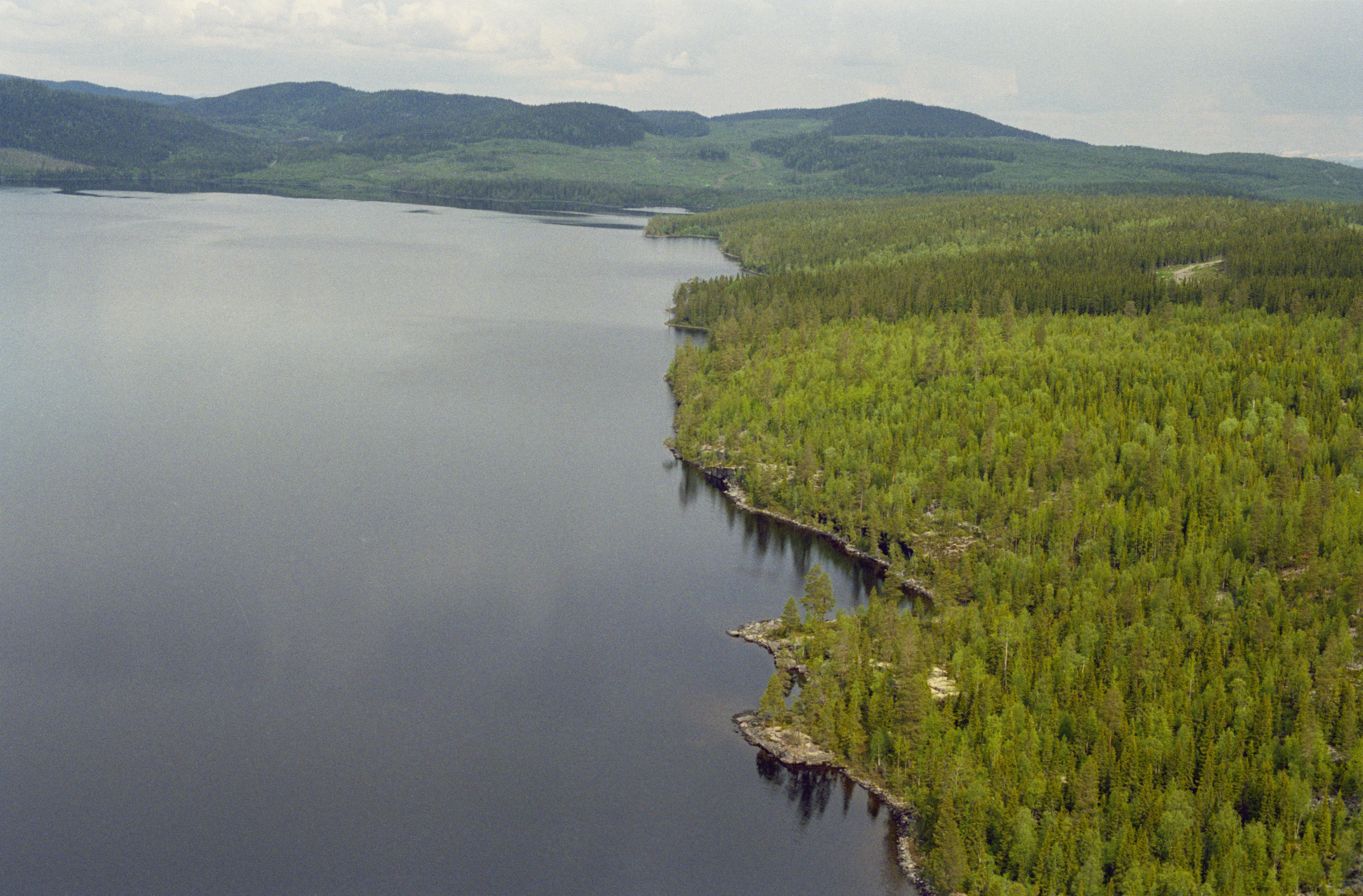 Beskrivning: Skärvångssjön norrväst om Norra Skärvångens by. Nere till höger Brattberget med hällmålning RAÄnr Föllinge 346:1 under Nordsjöberget. Uppe till höger hällmålning RAÄnr Föllinge 346:1 vid Hällberget och boplats Föllinge 175:1. Bilden är tagen mot (väderstreck): NV