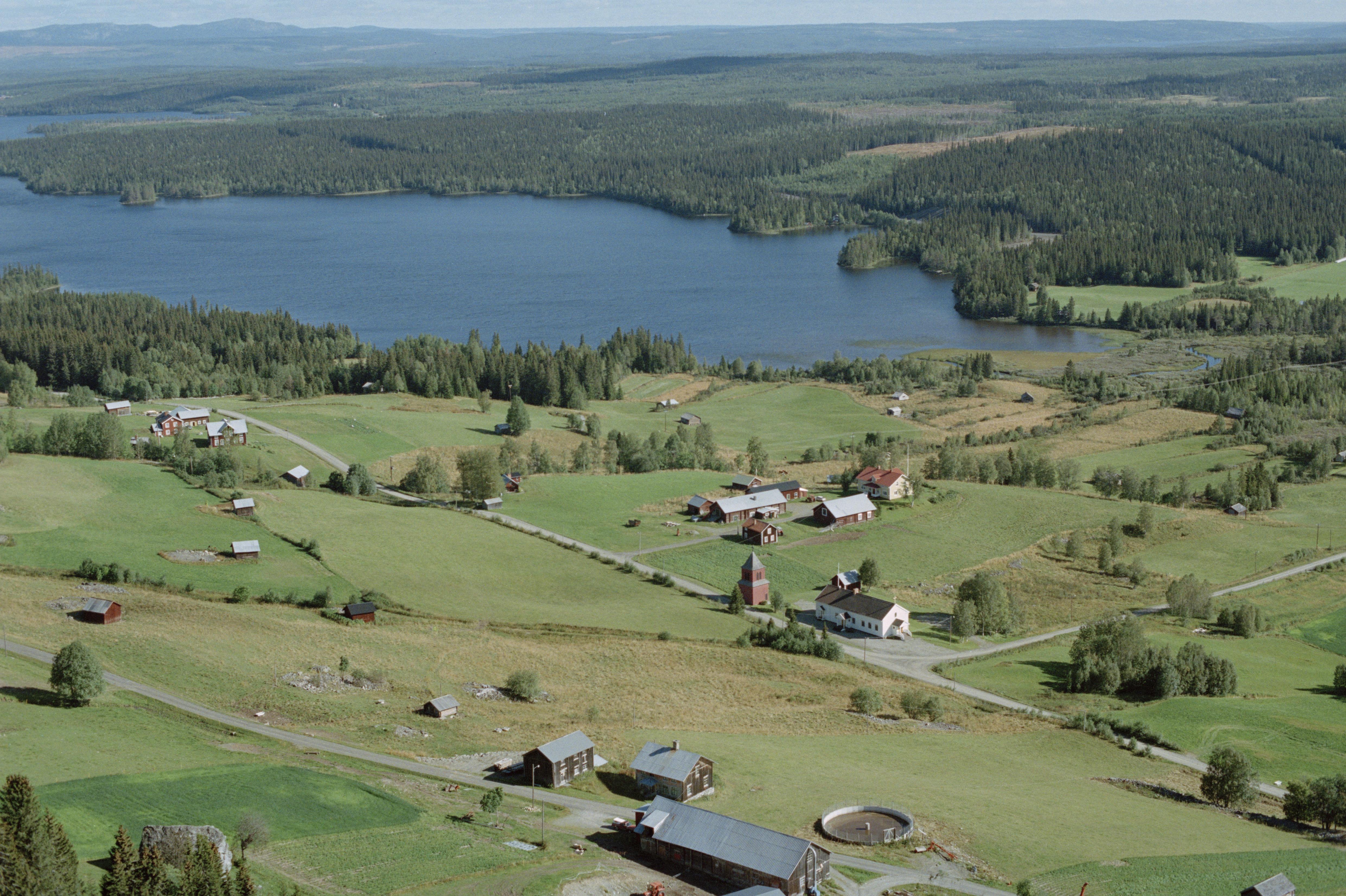 Beskrivning: Skärvångens by. Skärvångens kapell i bildens mitt. Till vänster om bildens mitt fångstgrop RAÄnr Föllinge 152:1. I bildens övre del byn Norra Skärvången med hällmålningsområden vid Skärvångssjön. Bilden är tagen mot (väderstreck): NO