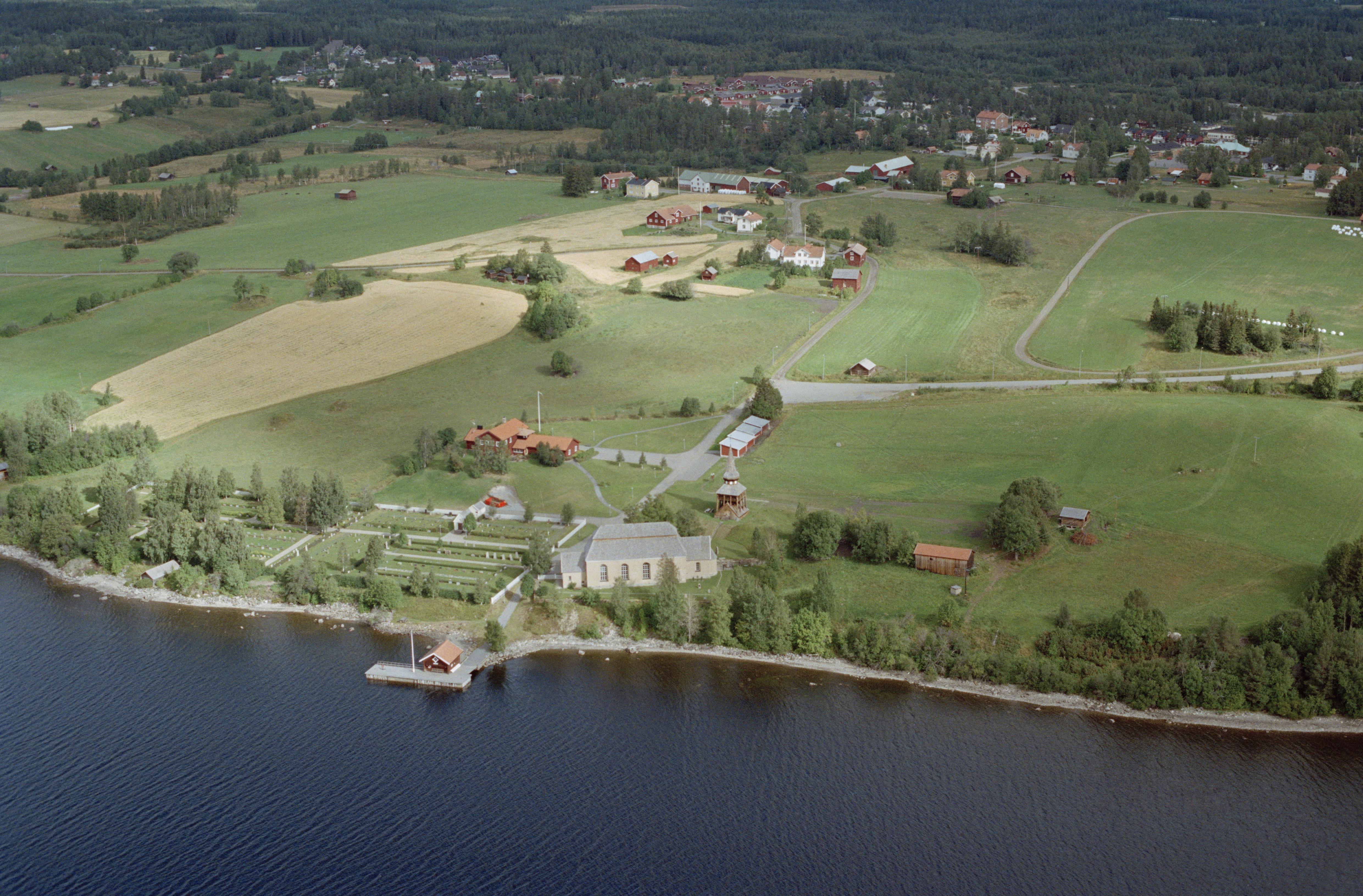 Beskrivning: Storsjön, östra sidan. Hackås kyrkby. Hackås kyrka och kastalruin RAÄnr Hackås 92:1 vid stranden till vänster under bildens mitt. Bilden är tagen mot (väderstreck): NO