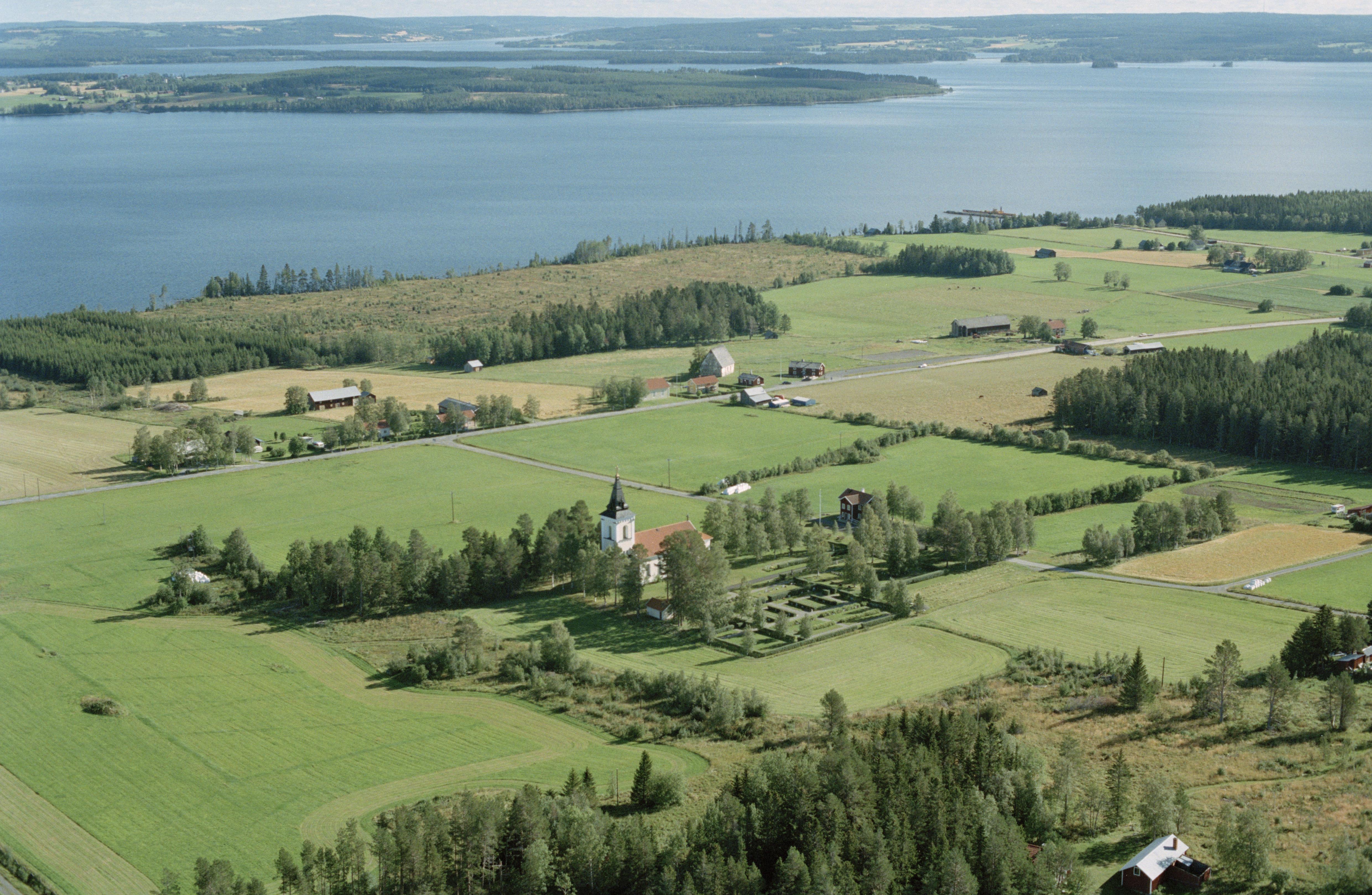 Beskrivning: Marby kyrkby vid Storsjön. Marby nya kyrka till vänster om bildens mitt. Marby gamla kyrka RAÄnr Marby 25:1 i bildens mitt. Bilden är tagen mot (väderstreck): ONO