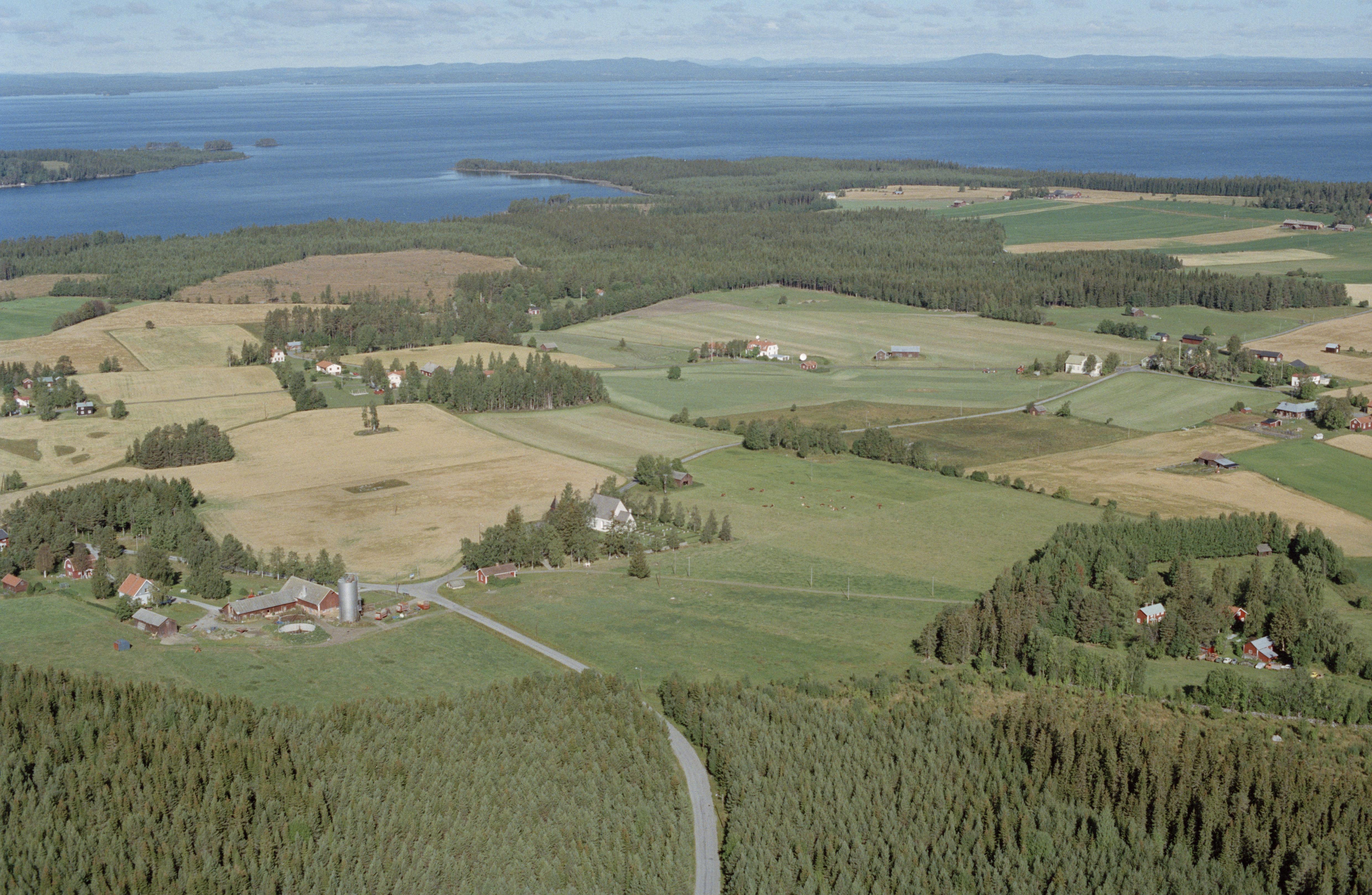 Beskrivning: Norderö kyrka och kyrkby på ön Norderön i Storsjön. Vid kyrkan flera högar, RAÄnr Norderö 19:1, 23:1, 31:1, till vänster om kyrkan gravfält Norderö 24:1 m.fl. Bilden är tagen mot (väderstreck): NNV