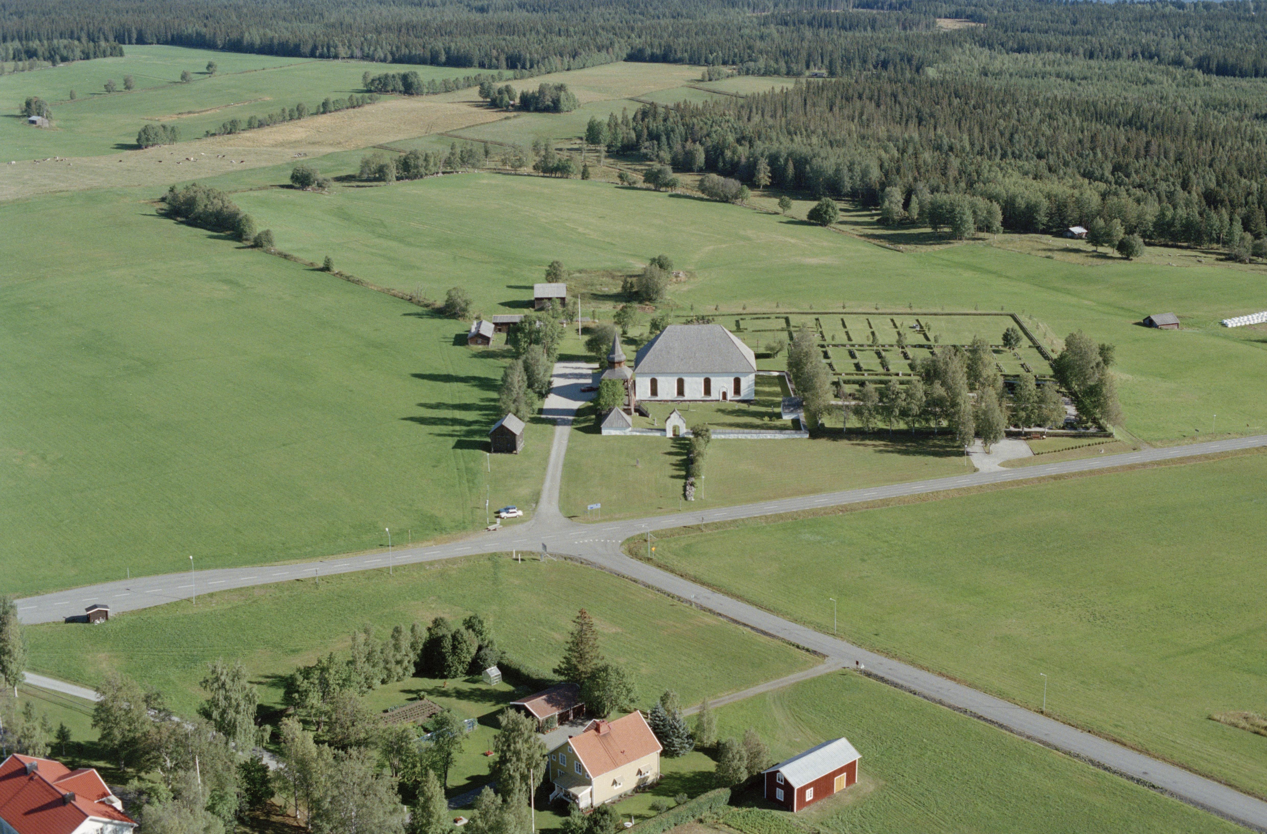 Beskrivning: Ovikens kyrkby. Ovikens gamla kyrka vid bildens mitt. Vid kyrkan minnesmärke och bytomt RAÄnr Oviken 57:1-2 m.fl. Bilden är tagen mot (väderstreck): NO