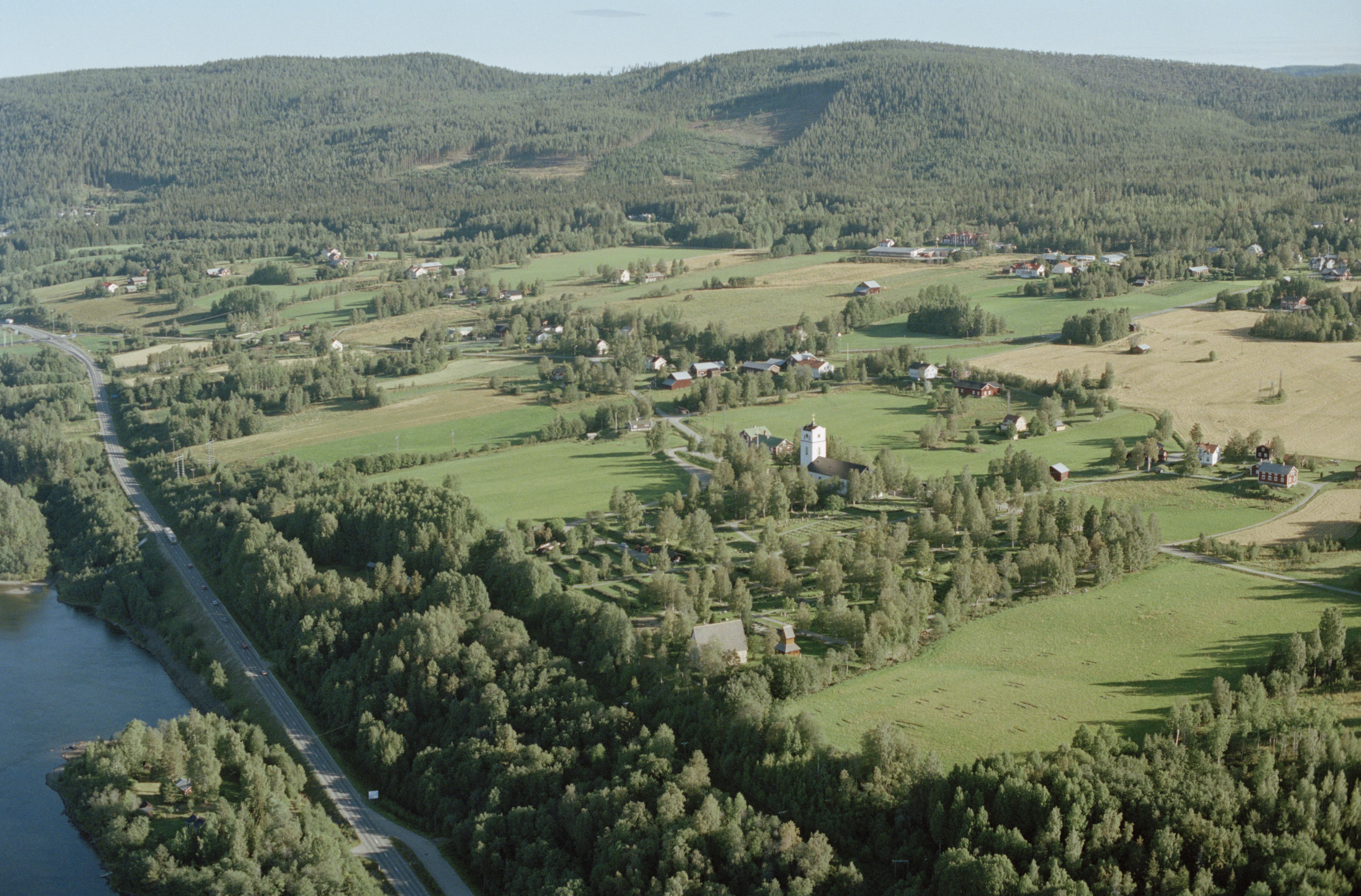 Beskrivning: Ragunda kyrkby vid Indalsälven. Ragunda gamla kyrka vid boplats RAÄnr Ragunda 65:1 under bildens mitt. Ragunda (nya) kyrka till höger om bildens mitt. Bilden är tagen mot (väderstreck): NO