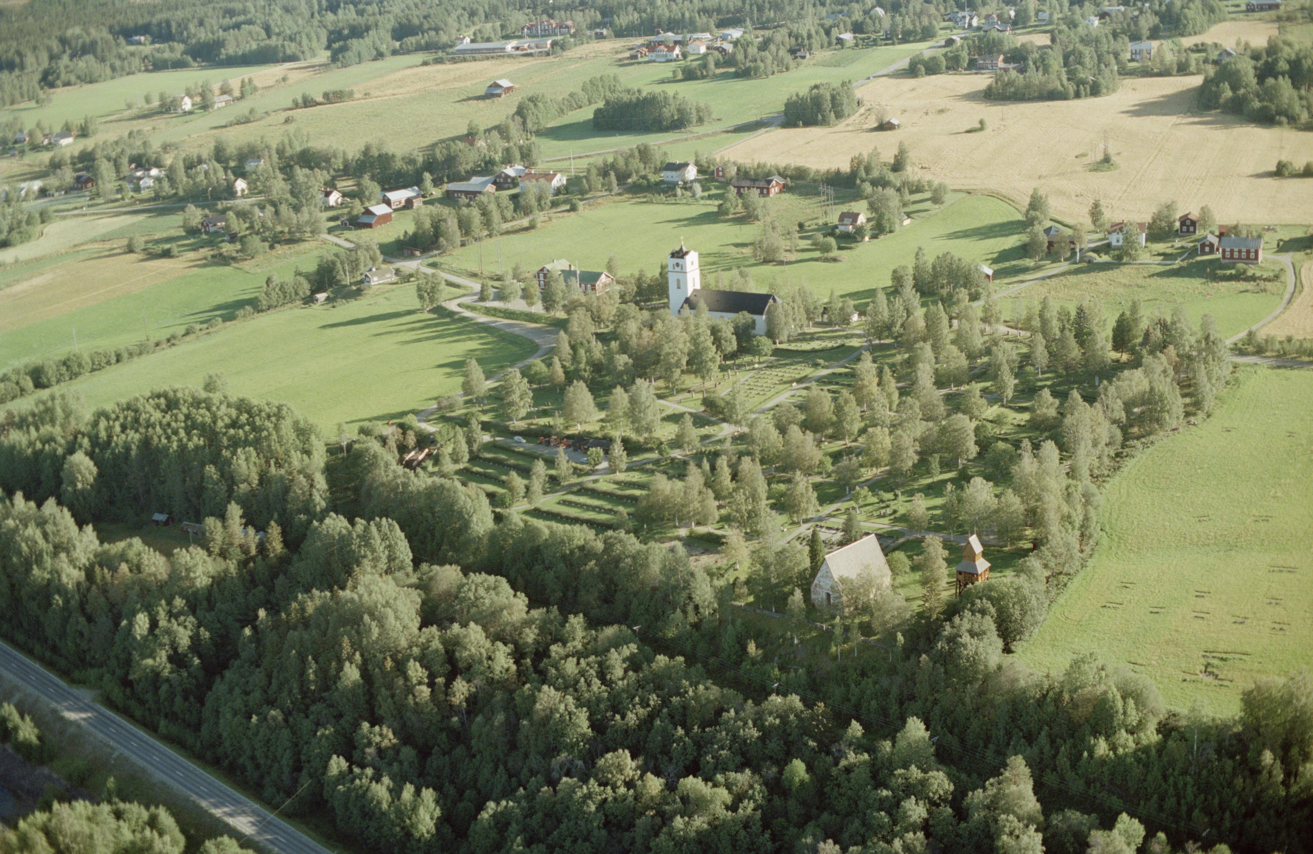 Beskrivning: Ragunda kyrkby vid Indalsälven. Nere till höger Ragunda gamla kyrka vid begravningsplats RAÄnr Ragunda 350:1. Ragunda (nya) kyrka uppe till vänster. Bilden är tagen mot (väderstreck): ONO