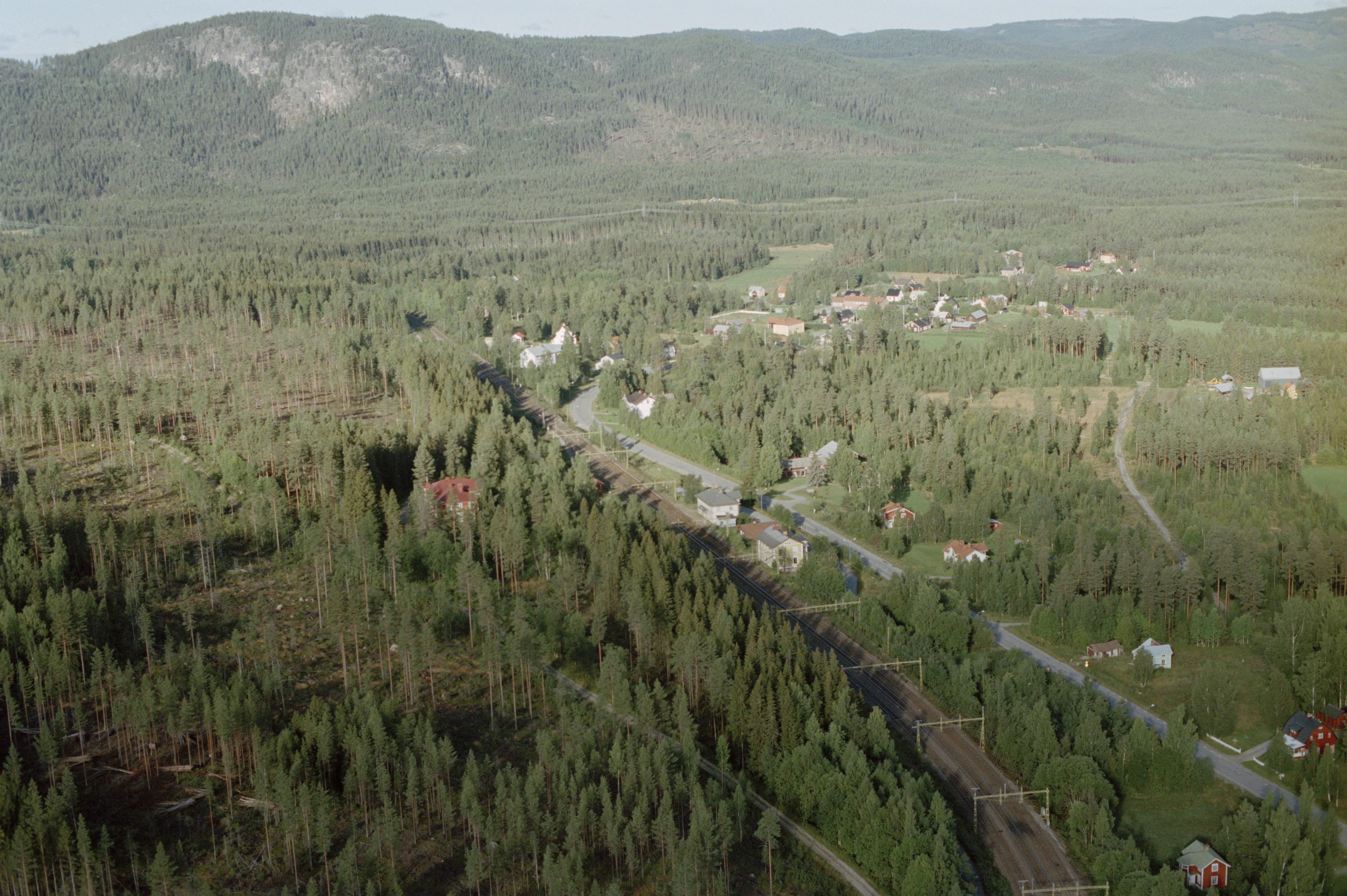 Beskrivning: Ragunda stationssamhälle i Singsåns dalgång. Vid bildens mitt Ragunda järnvägsstation. Fäbod RAÄnr Ragunda 140:1 vid Singsån i skogen uppe till vänster. Bilden är tagen mot (väderstreck): VNV