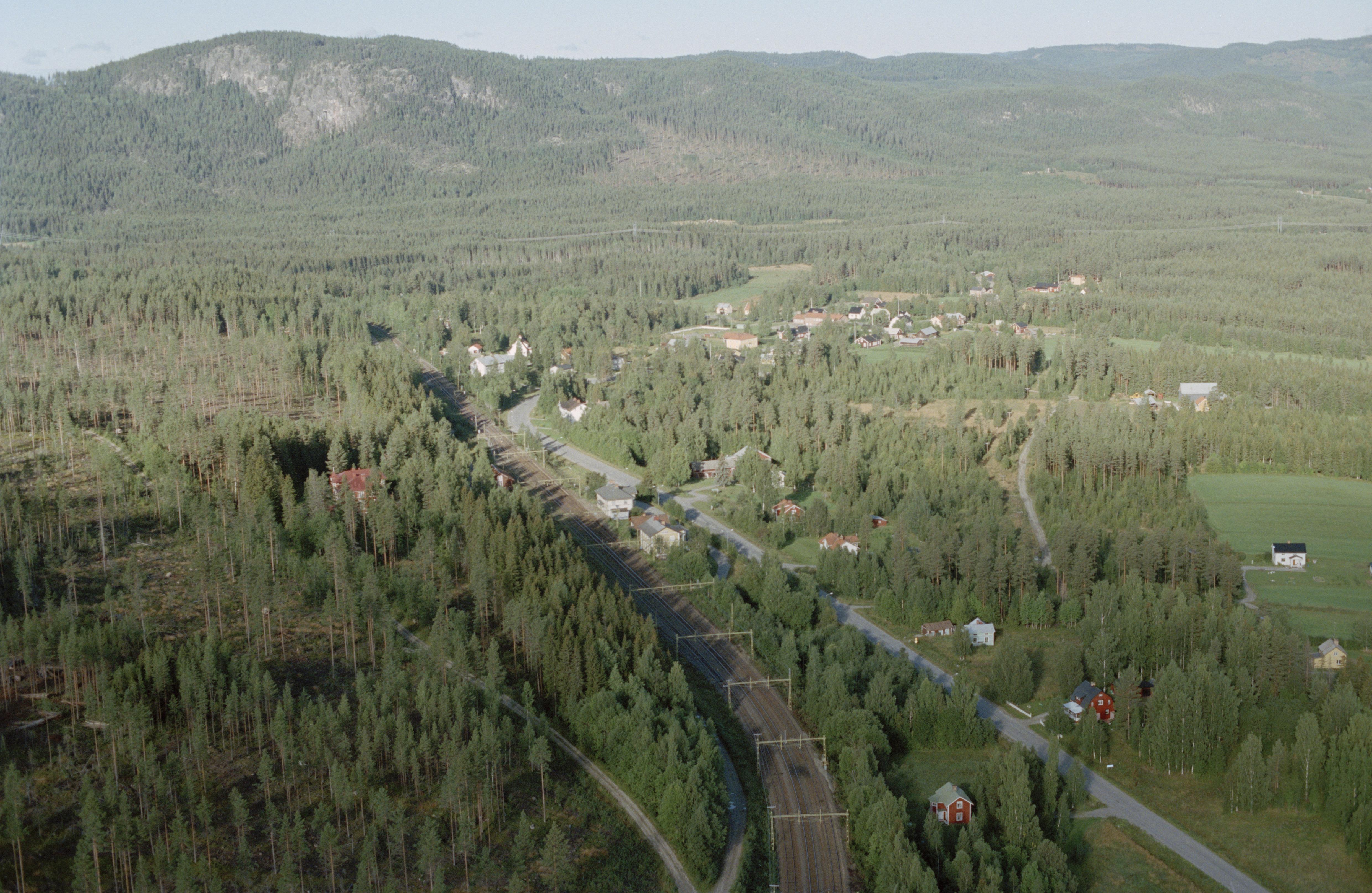 Beskrivning: Ragunda stationssamhälle i Singsåns dalgång. Vid bildens mitt Ragunda järnvägsstation. Fäbod RAÄnr Ragunda 140:1 vid Singsån i skogen uppe till vänster. Bilden är tagen mot (väderstreck): VNV