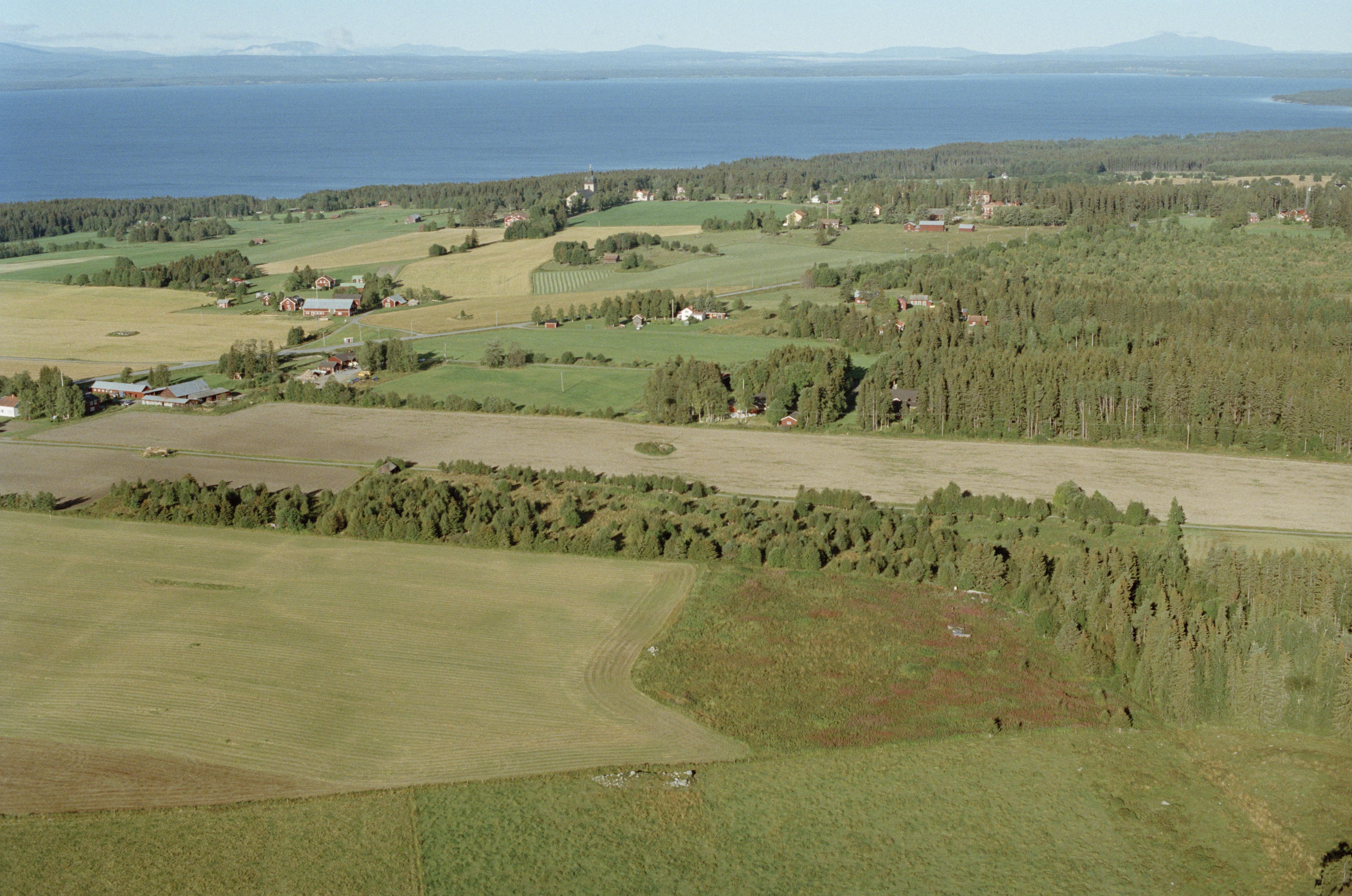 Beskrivning: Rödöns kyrkby. I bildens nedre del gravfält med högar öster om Rödöns kyrka. Högarna RAÄnr Rödön 41:1, 42:1, 43:1 m.fl, I bildens övre del Rödöns kyrka vid Storsjön. Bilden är tagen mot (väderstreck): V