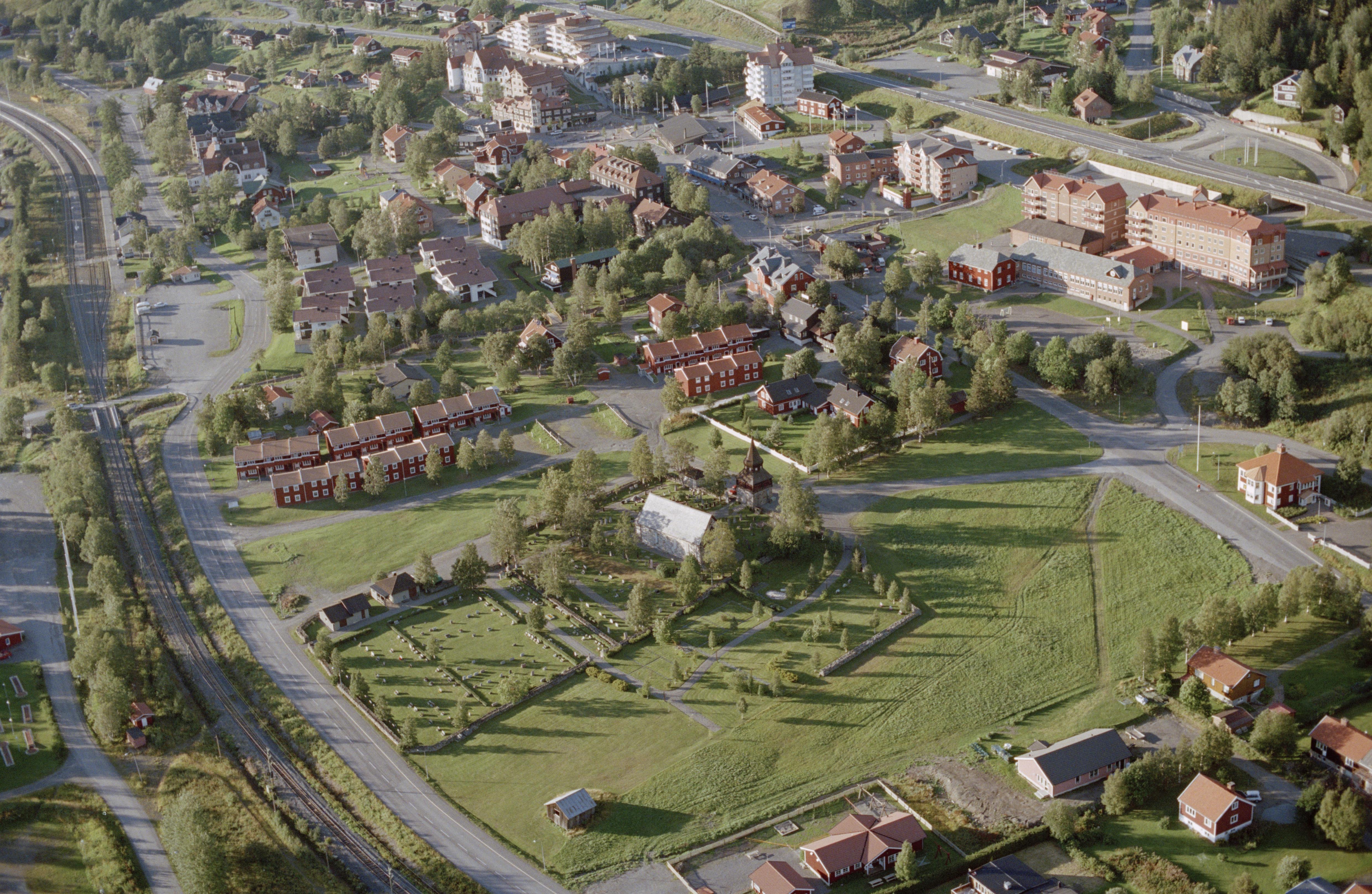 Beskrivning: Åre tätort, turistort och kyrkby vid Indalsälven. Vid bildens mitt Åre gamla kyrka. Vid kyrkan minnessten RAÄnr Åre 16:1. Bilden är tagen mot (väderstreck): N