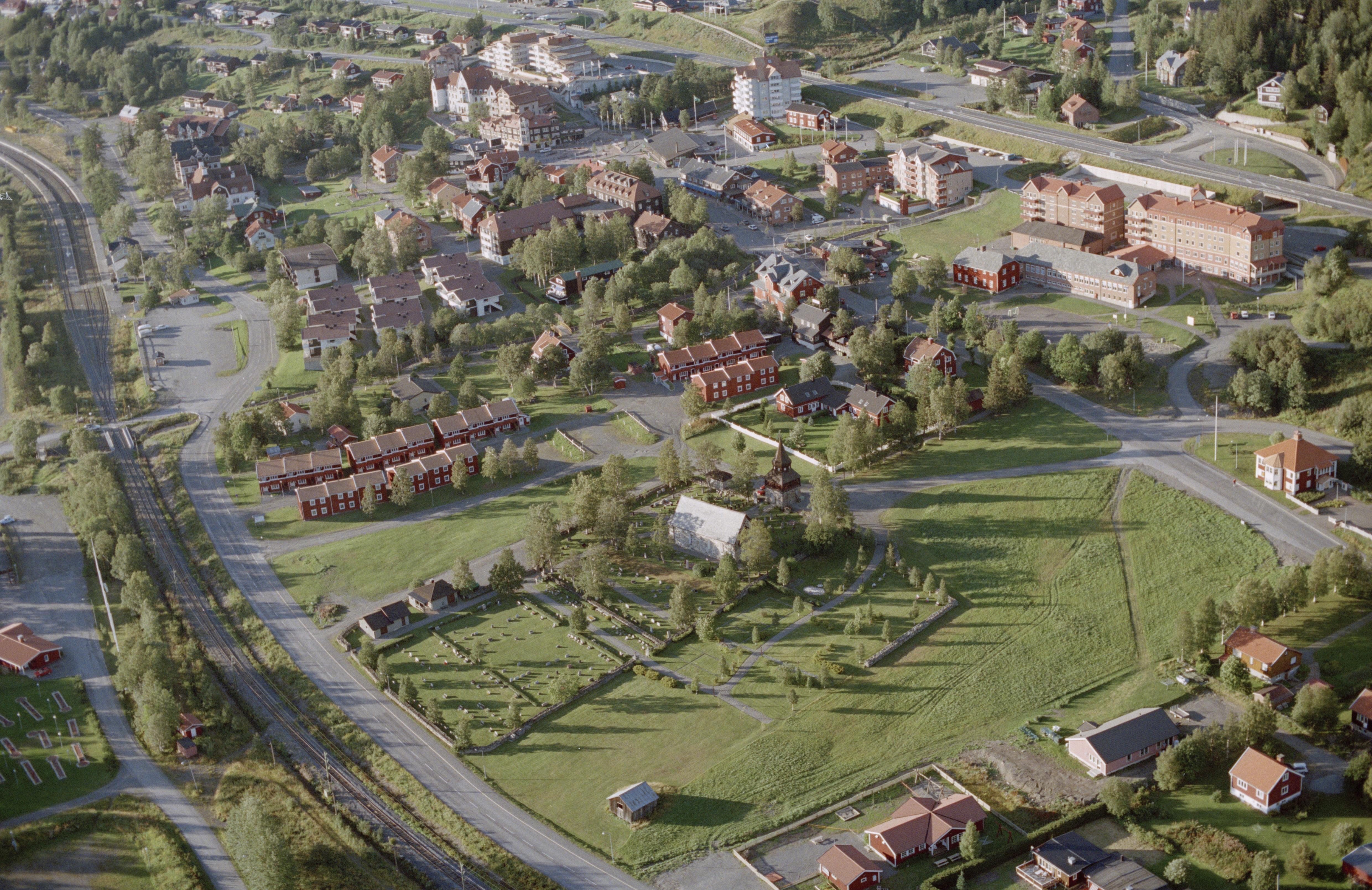 Beskrivning: Åre tätort, turistort och kyrkby vid Indalsälven. Vid bildens mitt Åre gamla kyrka. Vid kyrkan minnessten RAÄnr Åre 16:1. Bilden är tagen mot (väderstreck): N