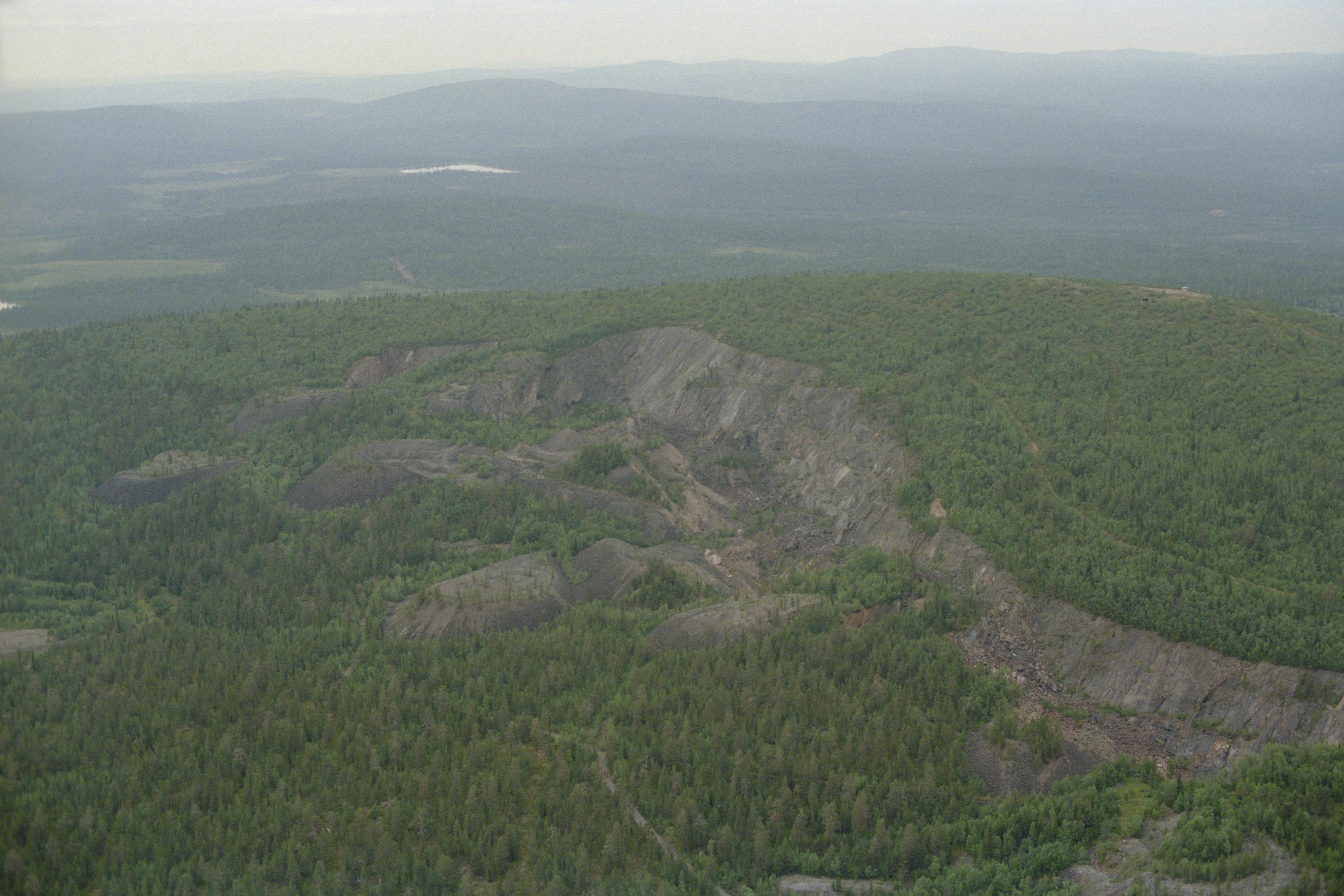 Beskrivning: Dagbrottet Kungsryggen i östra delen av tätorten Malmberget (Malmivaara / Málmmavárre), väster om Koskullskulle tätort och Linaälven (Lijnáädno). Bilden är tagen mot (väderstreck): Ö