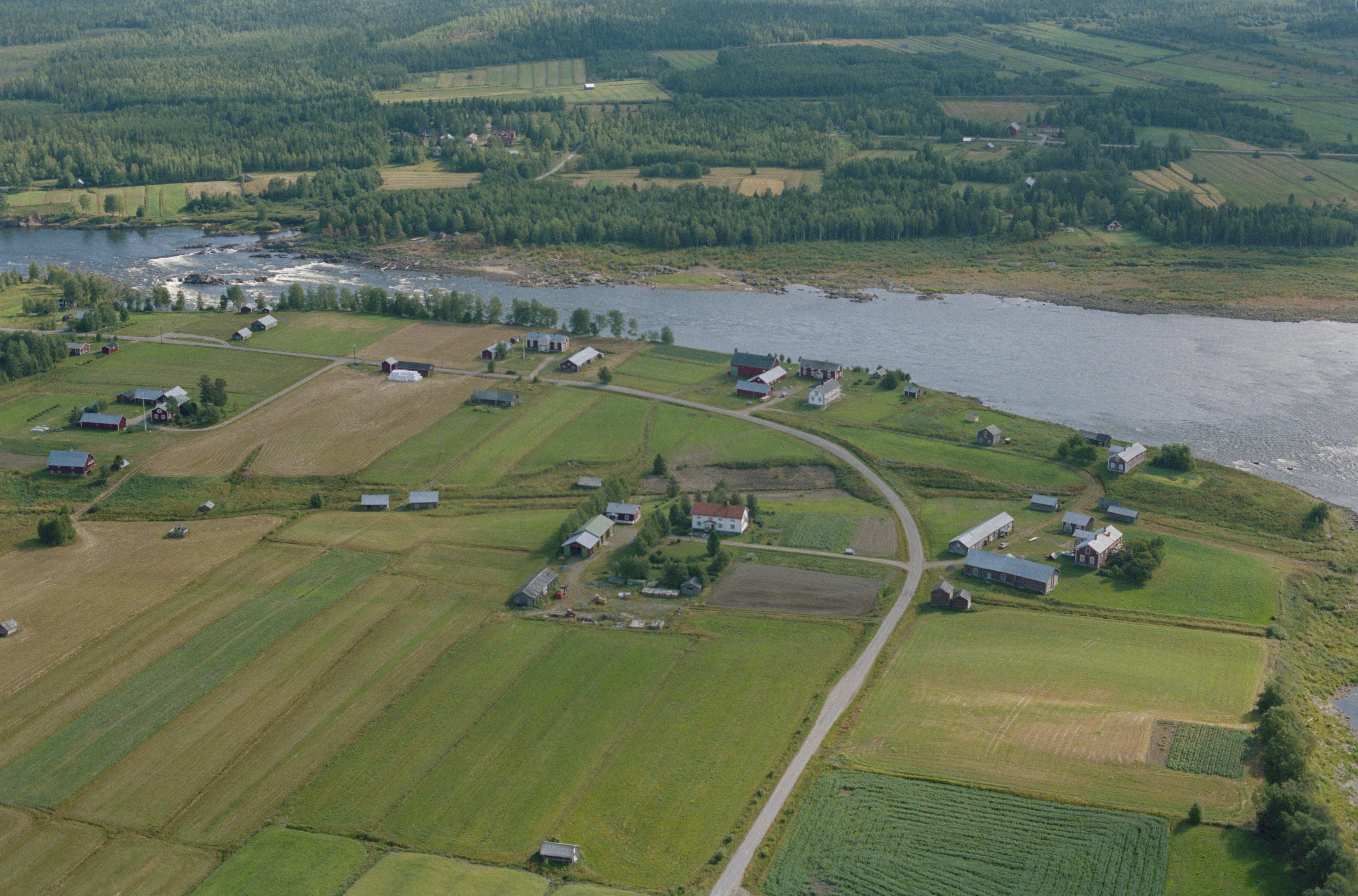 Beskrivning: Torneälven i Tornedalen. Uppe till vänster forsområdet Matkakoski norr i Korpikylä by. Vid älvkanten bytomt RAÄnr Karl Gustav 156:1, minnesmärke Karl Gustav 281:1, m.m. Torneälven markerar riksgränsen mot Finland (i bildens övre del). Bilden är tagen mot (väderstreck): ONO