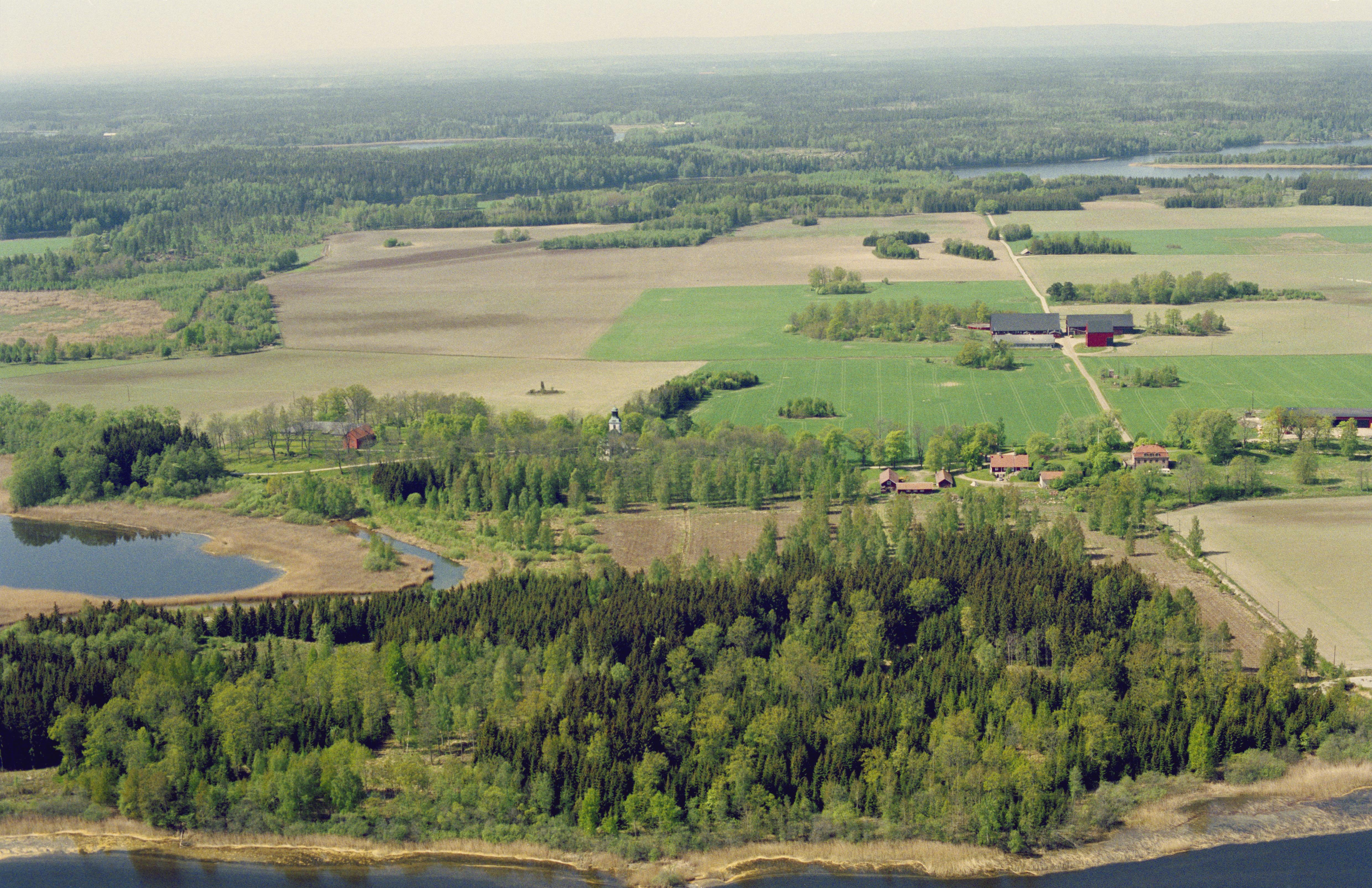 Beskrivning: Vid sjön Väringen. Från vänster slottsruin Kägleholm RAÄnr Ödeby 8:1 (under grått skiffertak) Ödeby kyrka och Kägleholms herrgård / säteri. Bilden är tagen mot (väderstreck): VNV