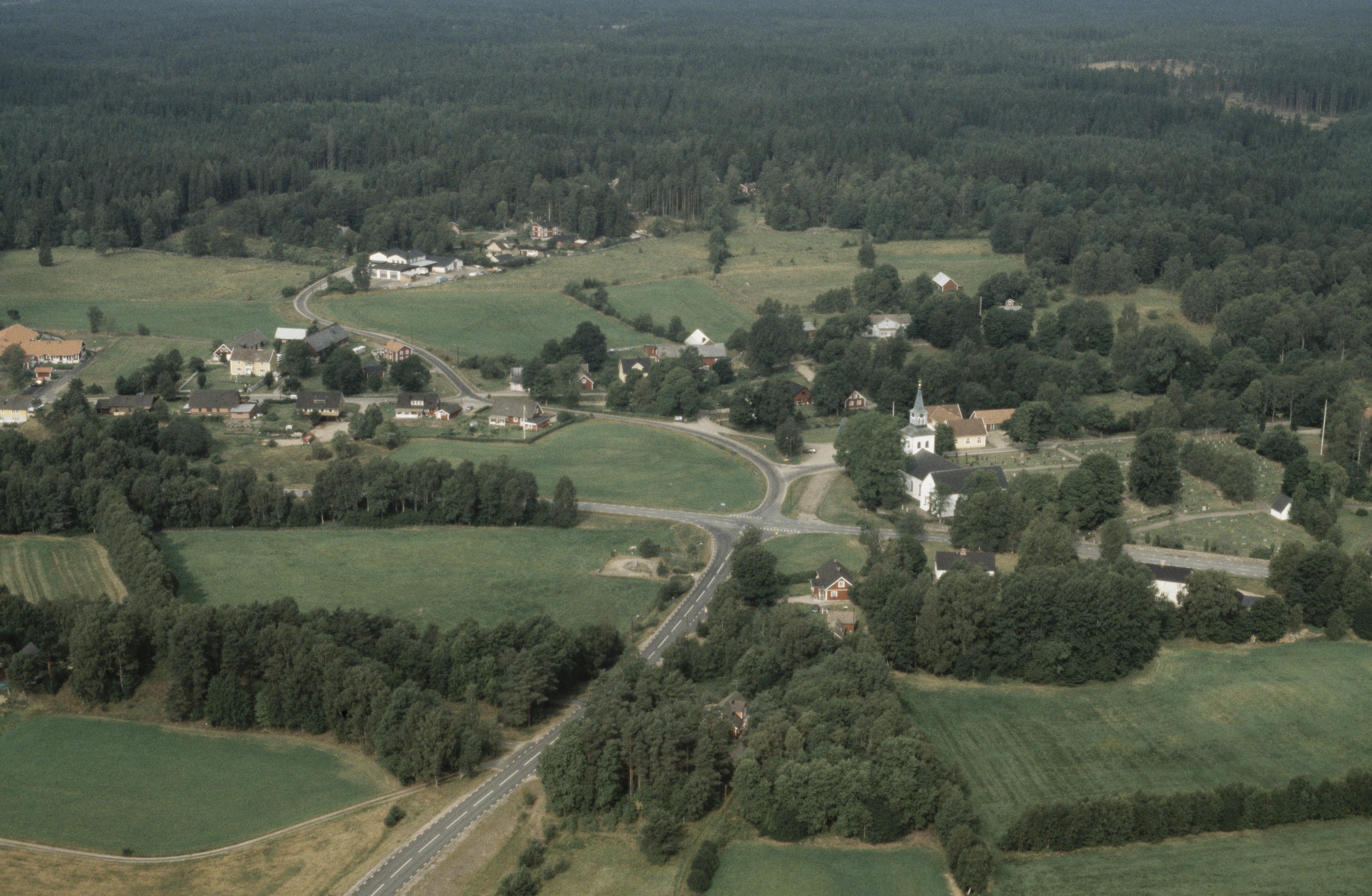 Beskrivning: Loshults kyrka och kyrkby. Bilden är tagen mot (väderstreck): NV