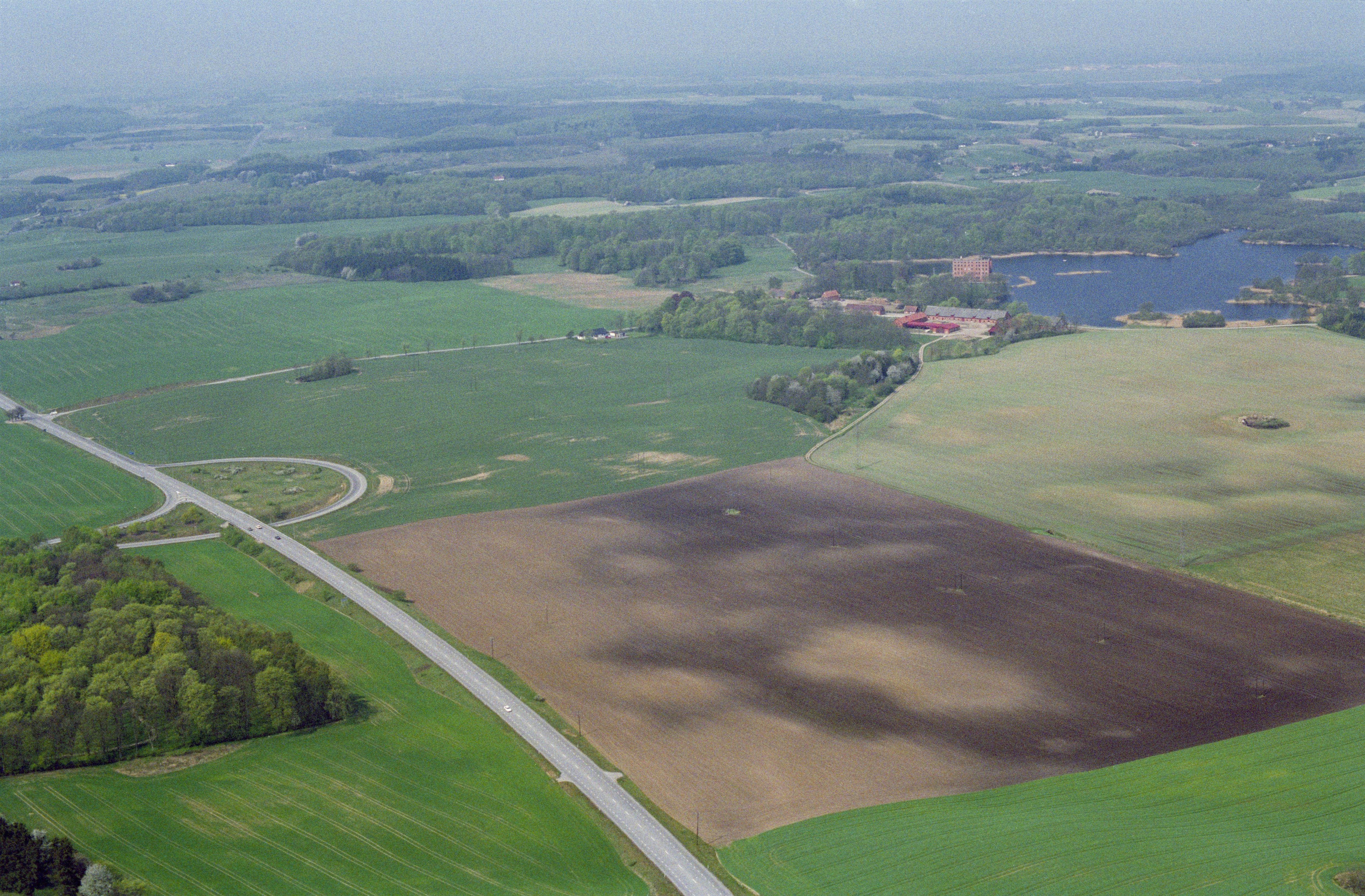 Beskrivning: I bildens övre del till höger Svaneholms slott vid Svaneholmssjön. Bilden är tagen mot (väderstreck): NV