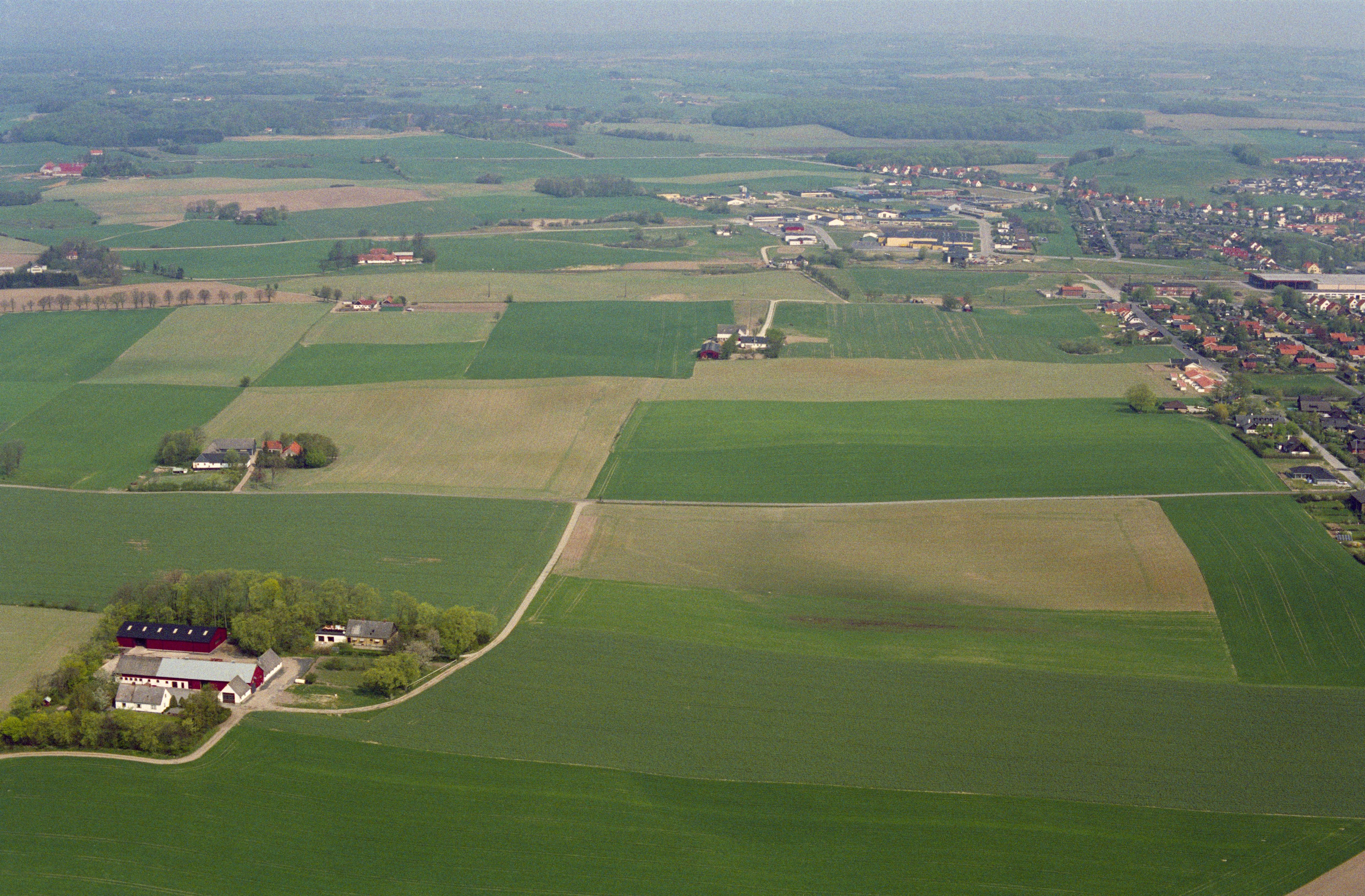 Beskrivning: MacLeans åkrar i området vid Saritslöv. I bildens vänstra del kyrkoruin och ödekyrkogård RAÄnr Skurup 12:1-2. Nere till vänster gården Elinelund. Bilden är tagen mot (väderstreck): N