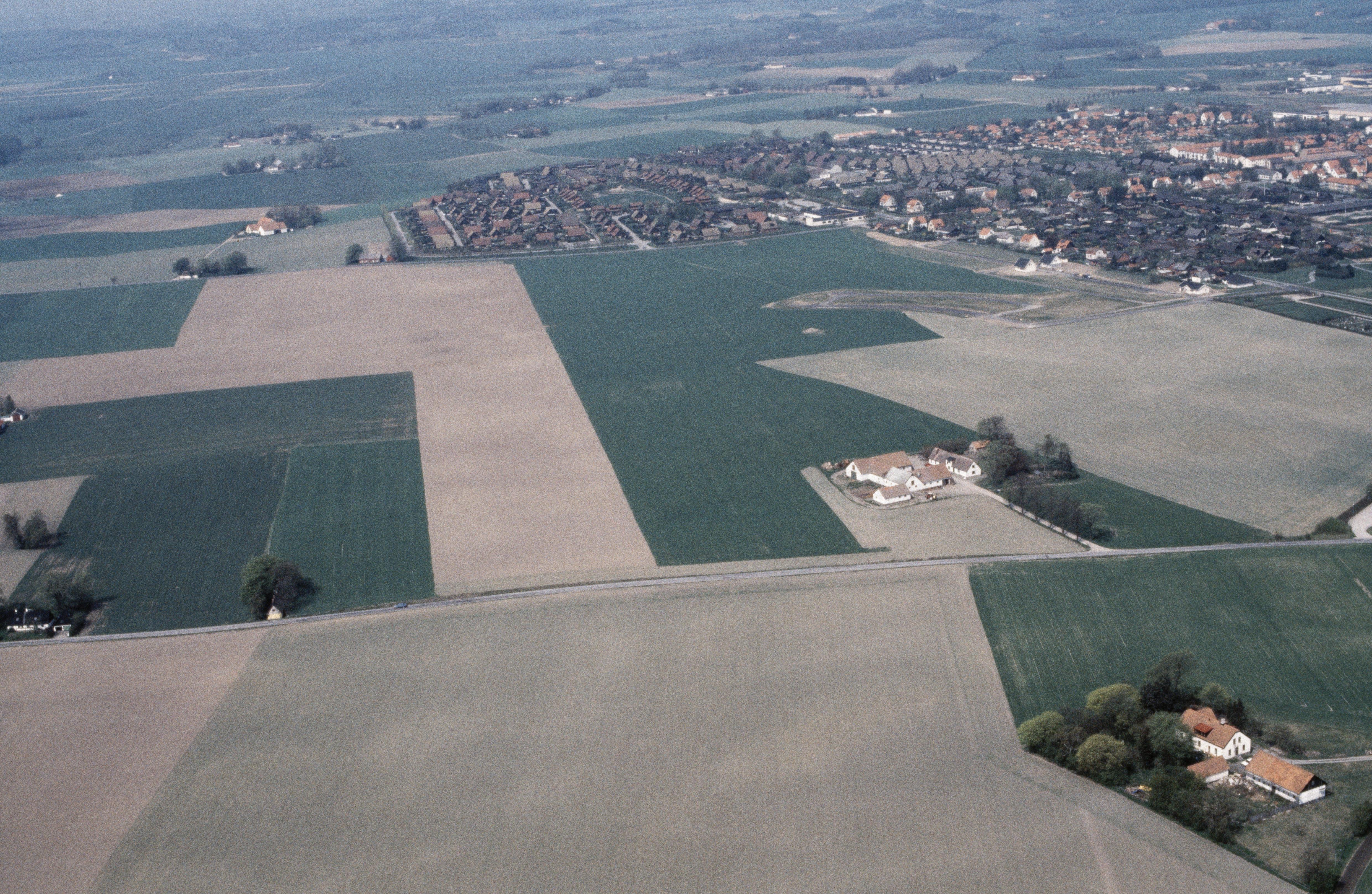 Beskrivning: MacLeans åkrar i området vid Saritslöv. I bildens nedre del Kyrkogatan söder i tätorten Skurup. Bilden är tagen mot (väderstreck): N