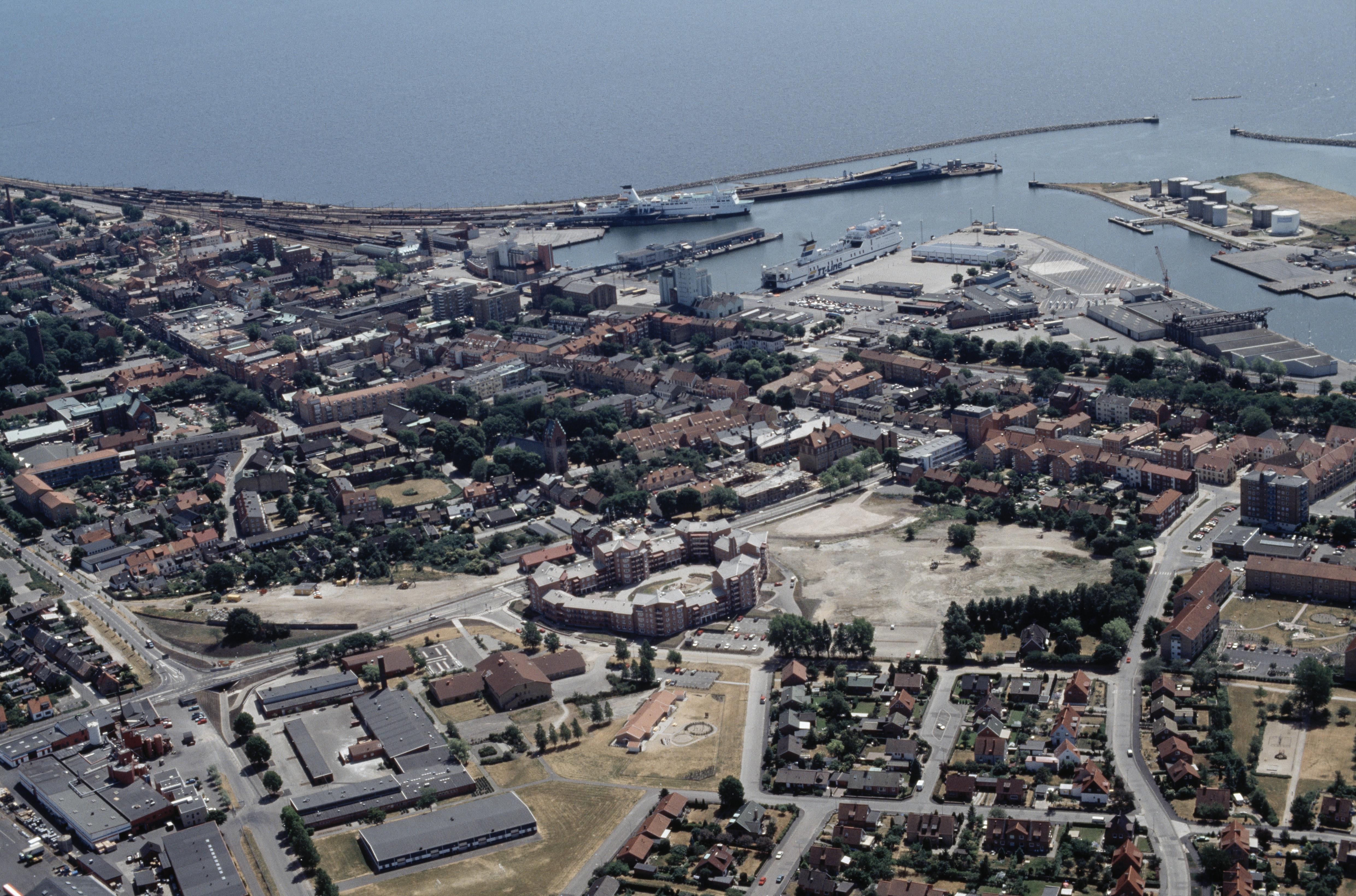 Beskrivning: Trelleborgs stad. Arkeologisk undersökning av fornborg "Trelleborgen" RAÄnr Trelleborg 48 vid bildens mitt. Bilden är tagen mot (väderstreck): SSO