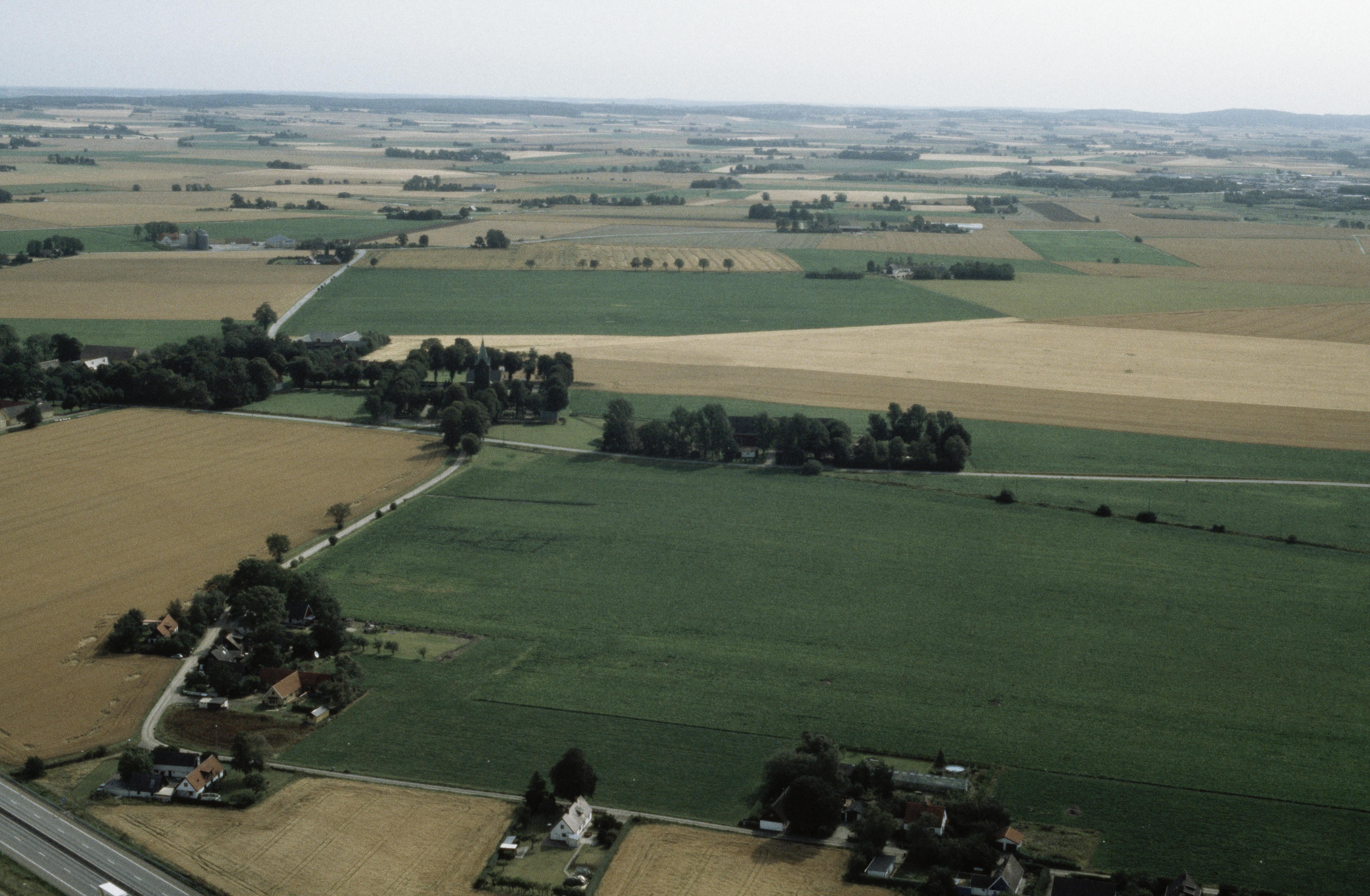 Beskrivning: Uppåkra kyrka och kyrkby till vänster om bildens mitt. Bilden är tagen mot (väderstreck): Ö