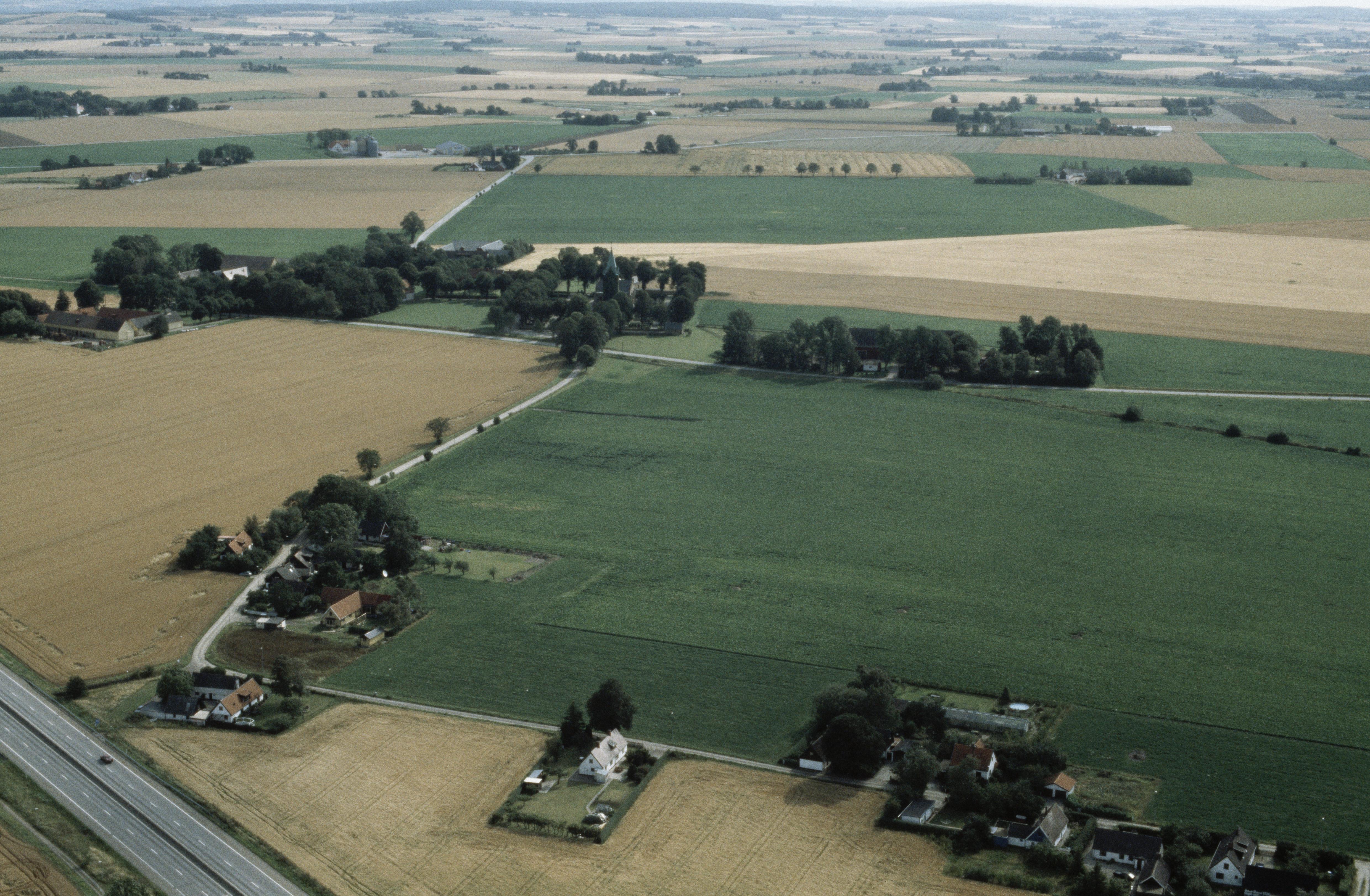 Beskrivning: Uppåkra kyrka och kyrkby till vänster om bildens mitt. Bilden är tagen mot (väderstreck): Ö