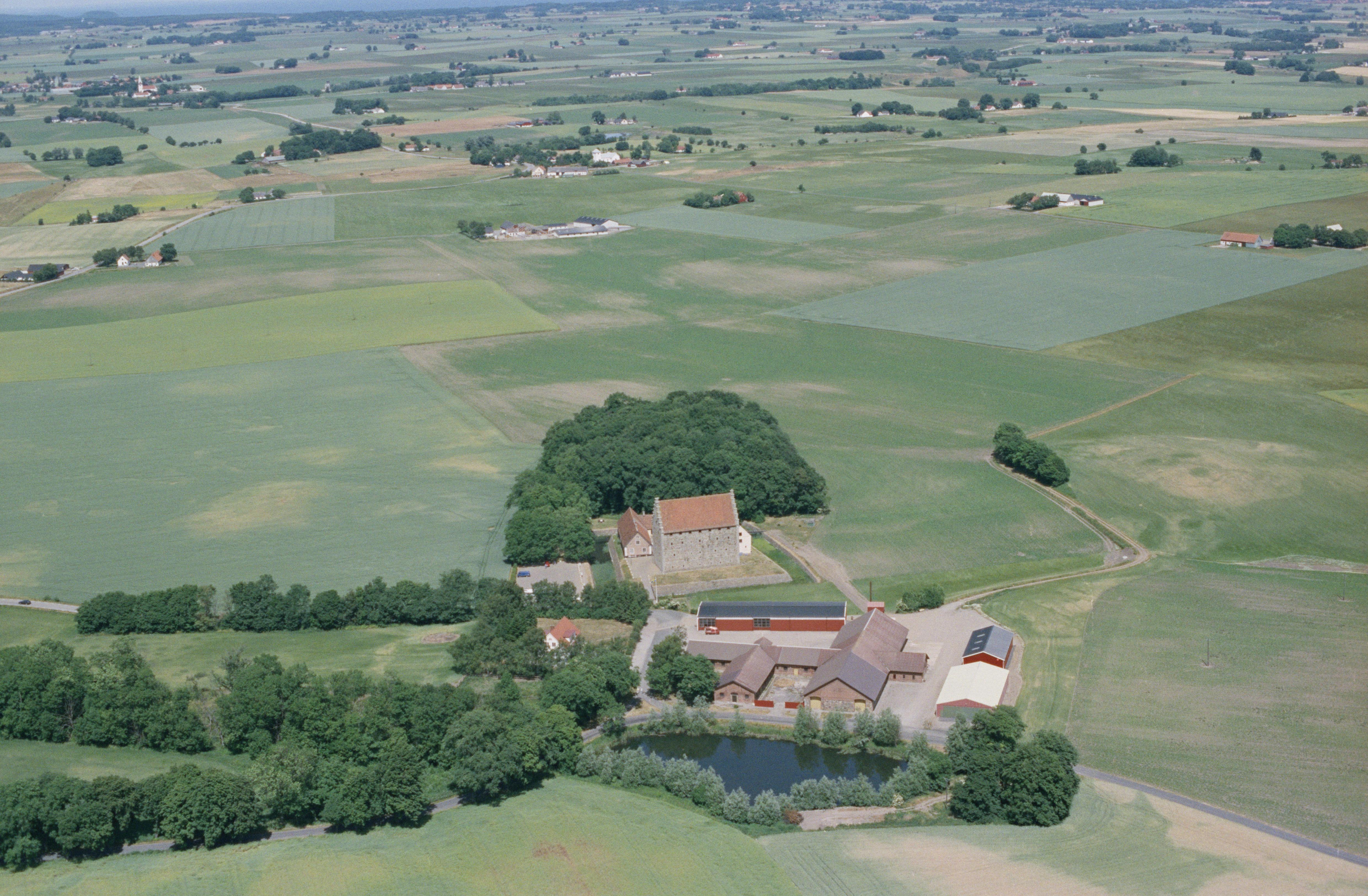 Beskrivning: Glimmingehus borg RAÄnr Vallby 5:1. Vallby kyrka till vänster i bildens övre del. Bilden är tagen mot (väderstreck): NO