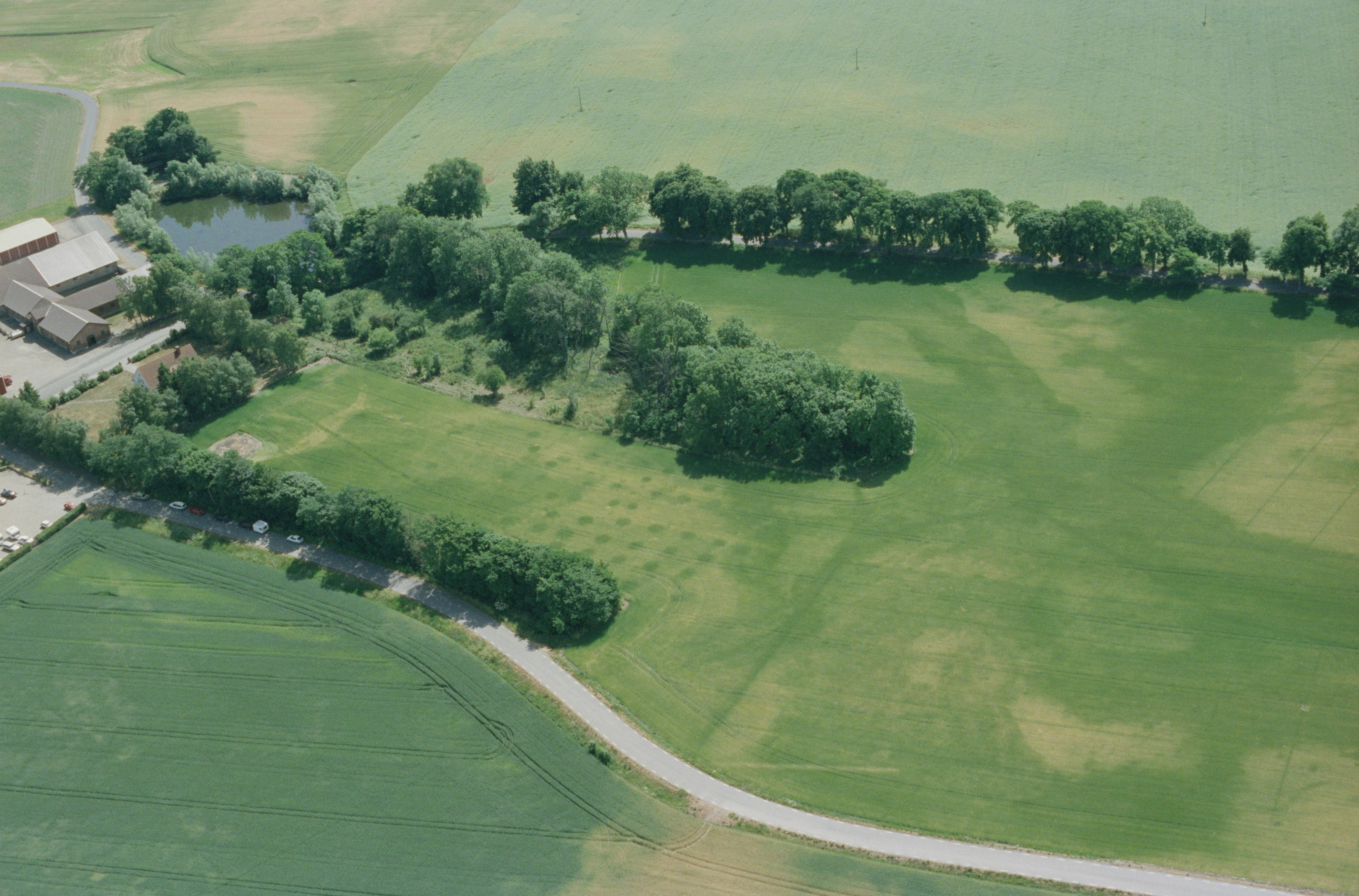 Beskrivning: Cropmarks efter borttagen äppelträdgård på västra sidan av Glimmingehus borg RAÄnr Vallby 5:1. Bilden är tagen mot (väderstreck): SSO