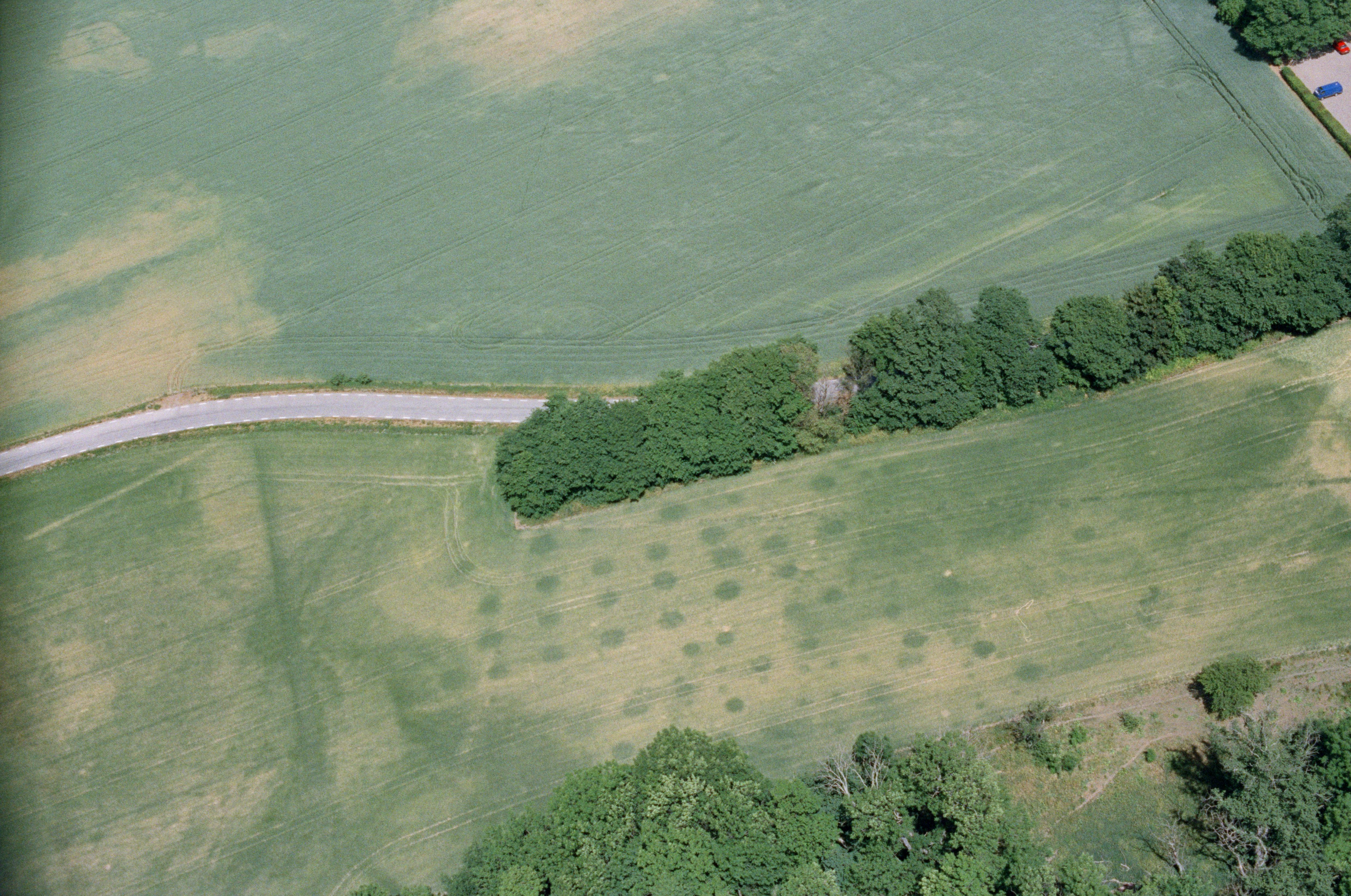 Beskrivning: Cropmarks efter borttagen äppelträdgård på västra sidan av Glimmingehus borg RAÄnr Vallby 5:1. Bilden är tagen mot (väderstreck): NO
