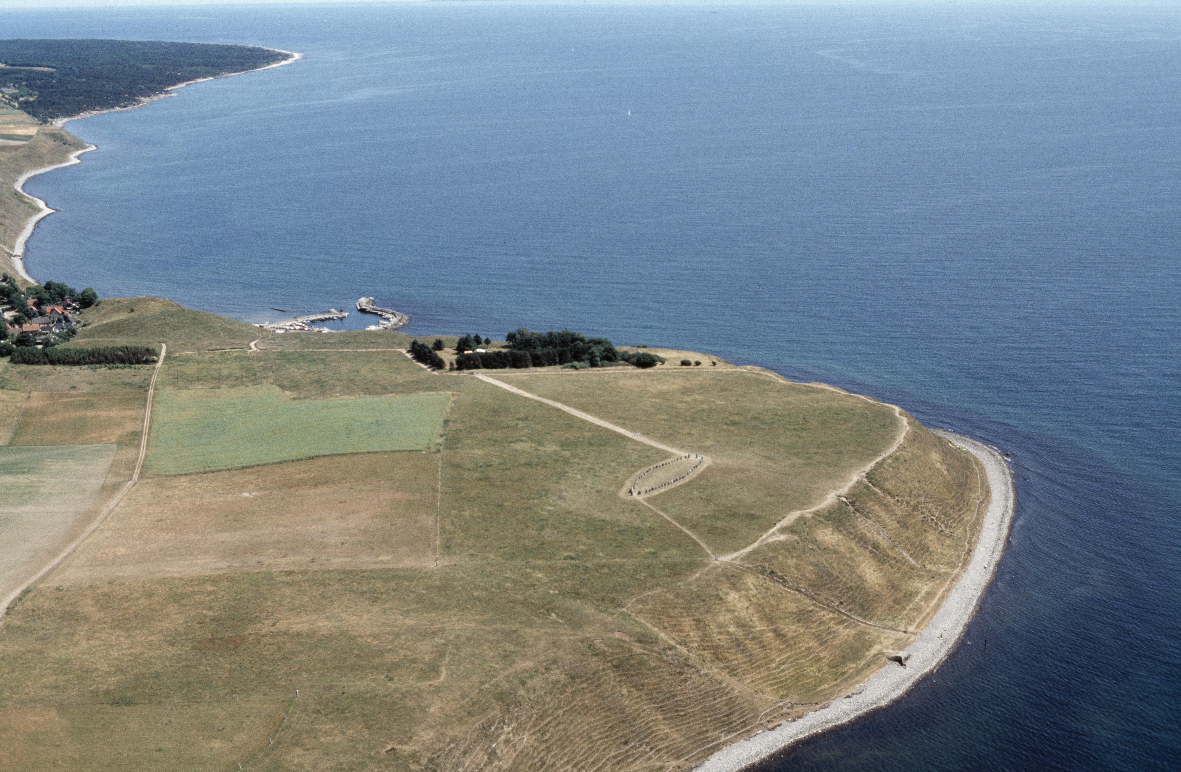 Beskrivning: Anmärkning (övrig): Riksintresse-nr/namn: M173 - Kåseberga. Socken: Valleberga socknar. Motivering: Fornlämningsmiljö med en av landets märkligaste och största skeppsättningar. - Uttryck för riksintresset: Skeppsättningen Ales stenar från yngre järnåldern med 58 resta stenar och dominerande läge på Kåsebergaåsen, lämningar efter två mindre skeppsättningar. - I området ingår även: Fiskeläget Kåseberga med koppling till den omgivande jordbruksbygden och ursprung i en medeltida fiskehamn med välbevarat oregelbundet gatumönster och ett byggnadsbestånd med såväl gårdar som gatehus från främst 1800-talet, hamnanläggning från tiden 1890-1950-tal samt fiskebodar och rökerier från 1900-talet. [Texten uppdaterat av Riksantikvarieämbetet våren 2013.] Beskrivning: Vid bildens mitt skeppssättningen Ales stenar RAÄnr Valleberga 20:1 vid Kåseberga. Bilden är tagen mot (väderstreck): OSO Fotosyfte: Flygbildsdokumentation
