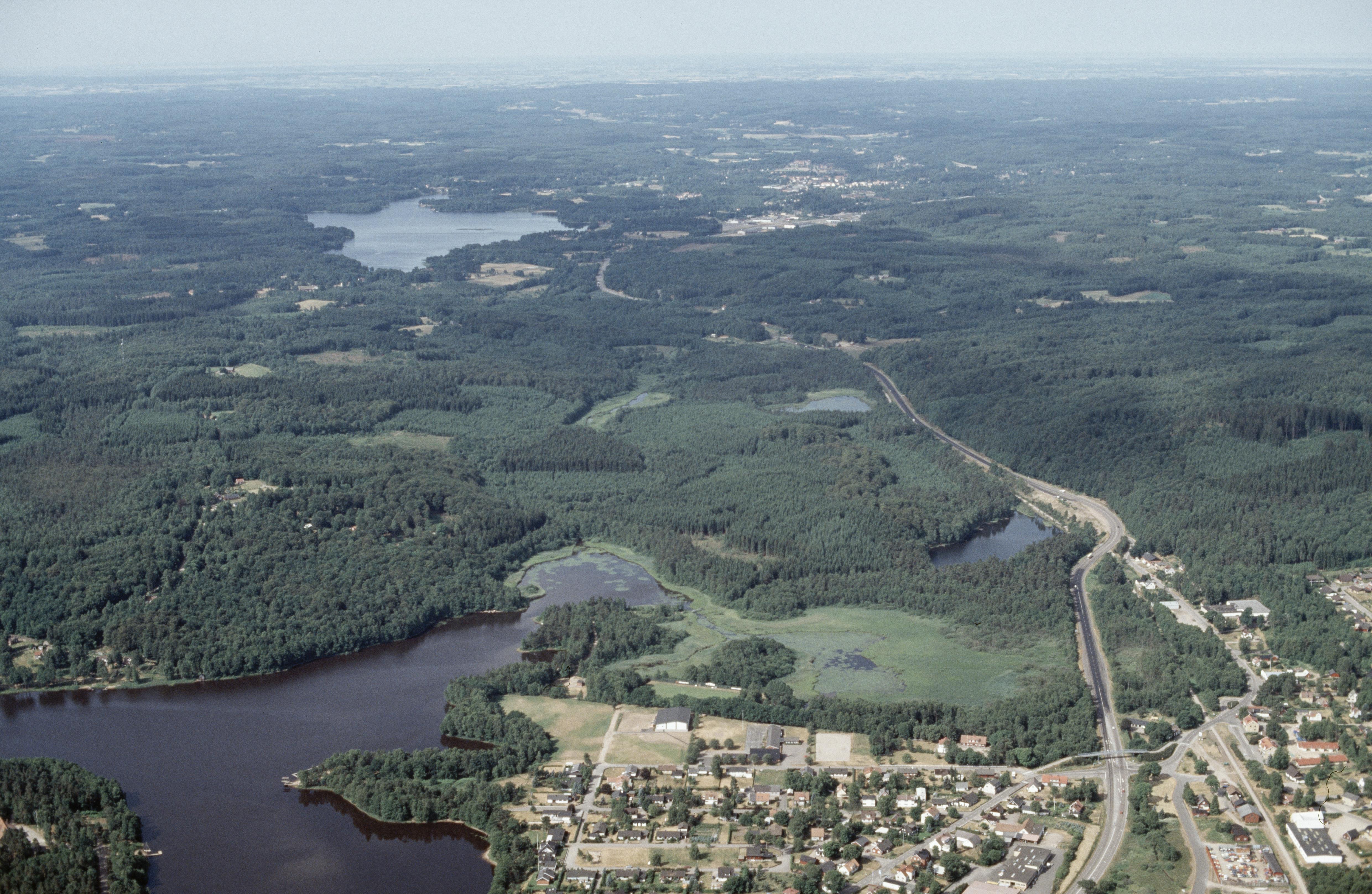 Beskrivning: Pinnåns dalgång mellan Åsljunga och Västra Spång. Blästbrukslämning RAÄnr Örkelljunga 5:1 vid bildens mitt. I bildens övre del Örkelljunga tätort vid Hjälmsjön. Bilden är tagen mot (väderstreck): VSV
