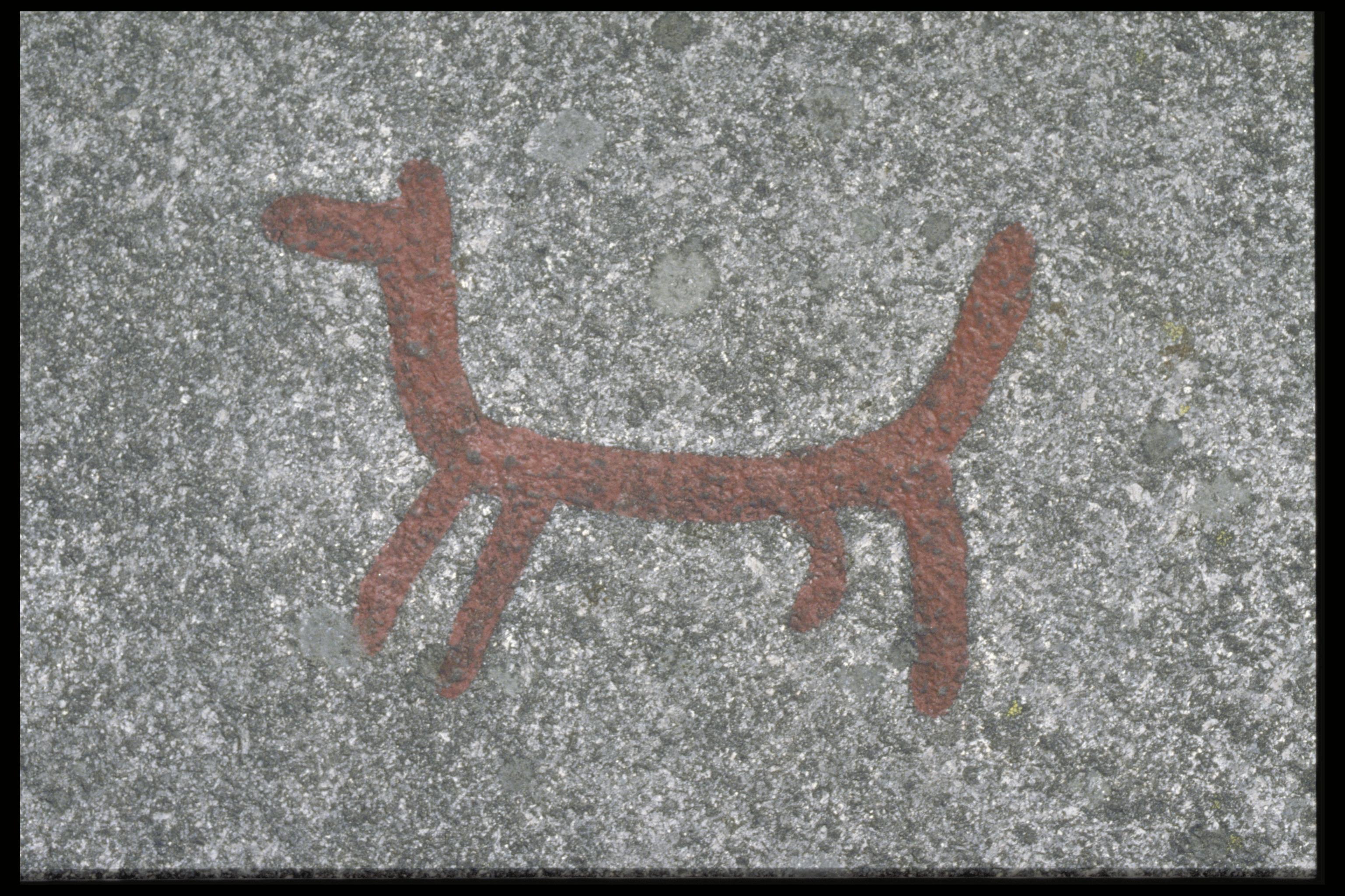 Djurfigur, hund. Lavbevuxen häll. Vitlyckehällen, Tanum 1:1.