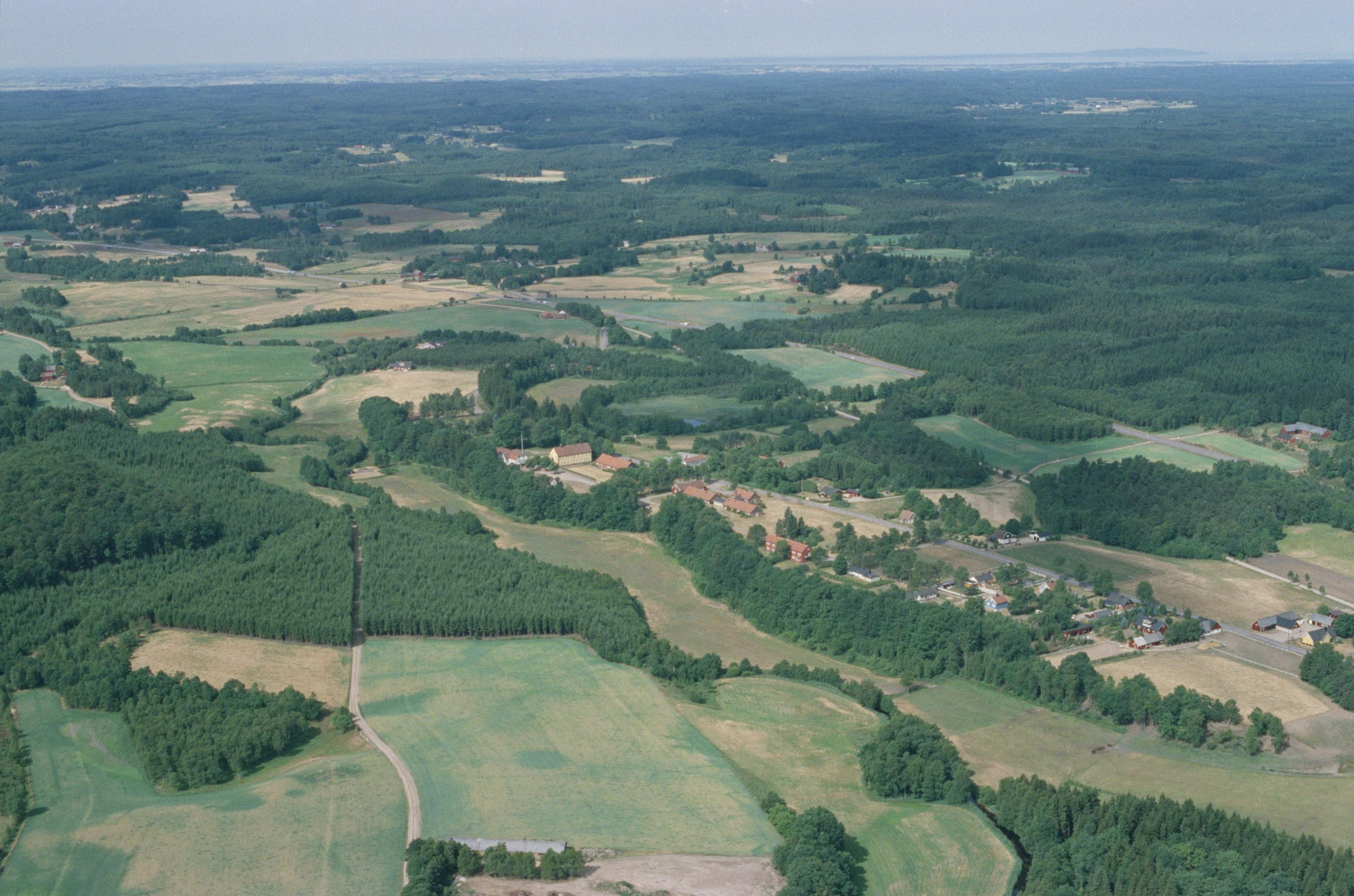 Beskrivning: Pinnån på gränsen mellan socknen Rya och Örkelljunga (i bildens nedre del). Ryagården Yrkesskola och blästbrukslämning RAÄnr Rya 13:1 vid bildens mitt. Bilden är tagen mot (väderstreck): V