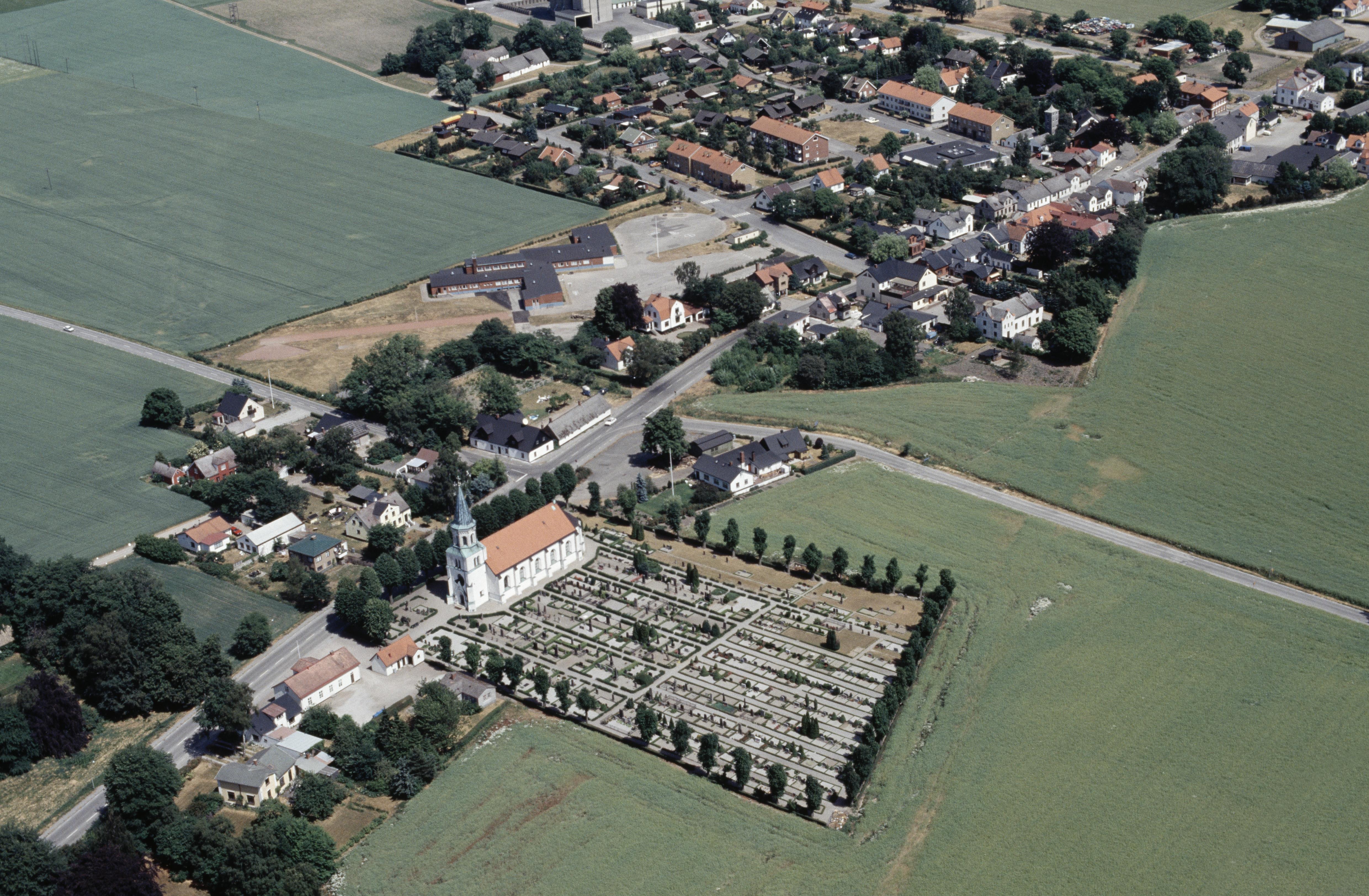 Beskrivning: Östra Klagstorps kyrka och kyrkby. Bilden är tagen mot (väderstreck): NO