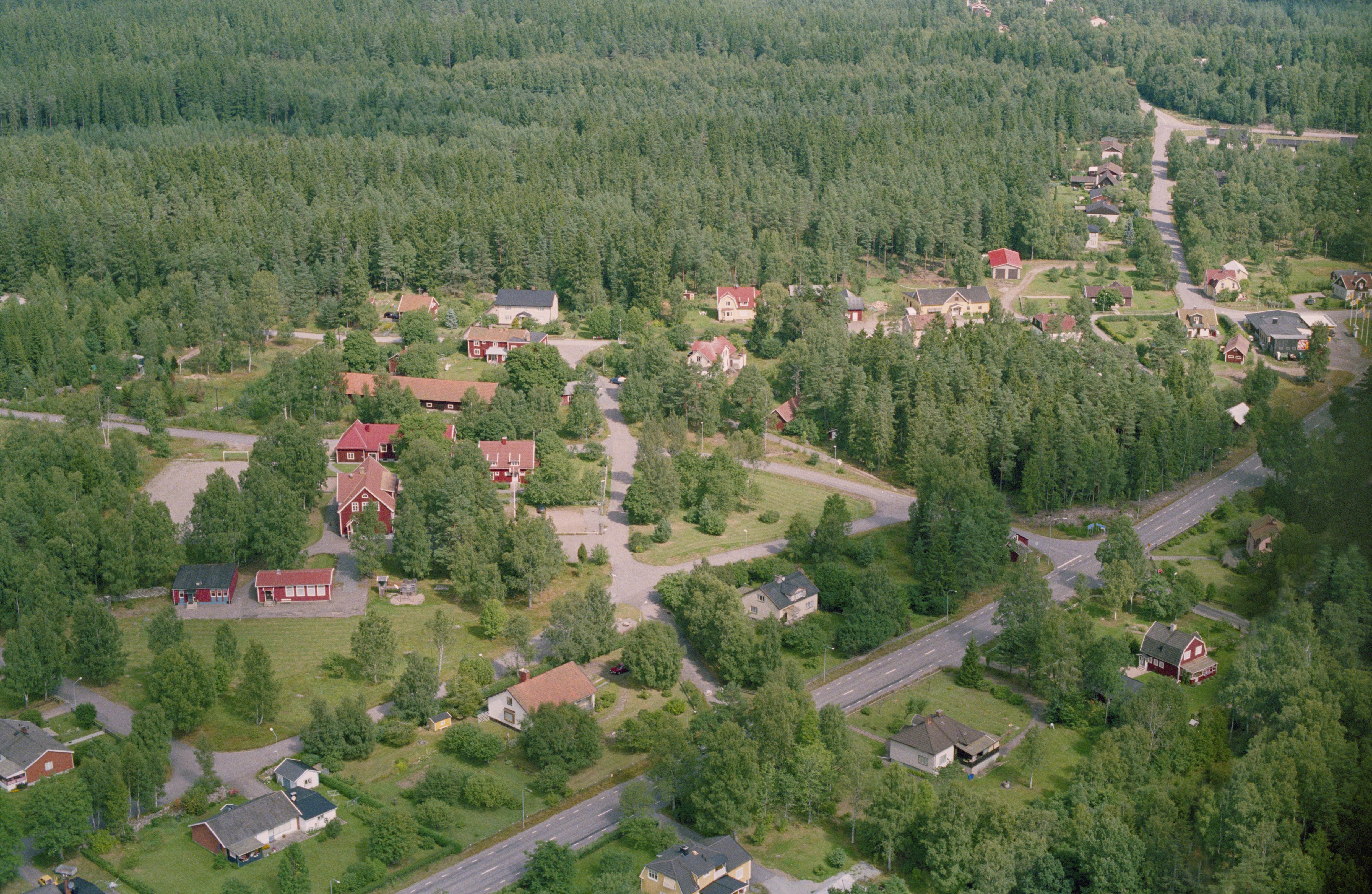 Beskrivning: Eriksmåla tätort. Marknadsplatsen / samlingsplatsen RAÄnr Algutsboda 55:1 och vägmärke Algutsboda 56:1 uppe till höger. Bilden är tagen mot (väderstreck): NO