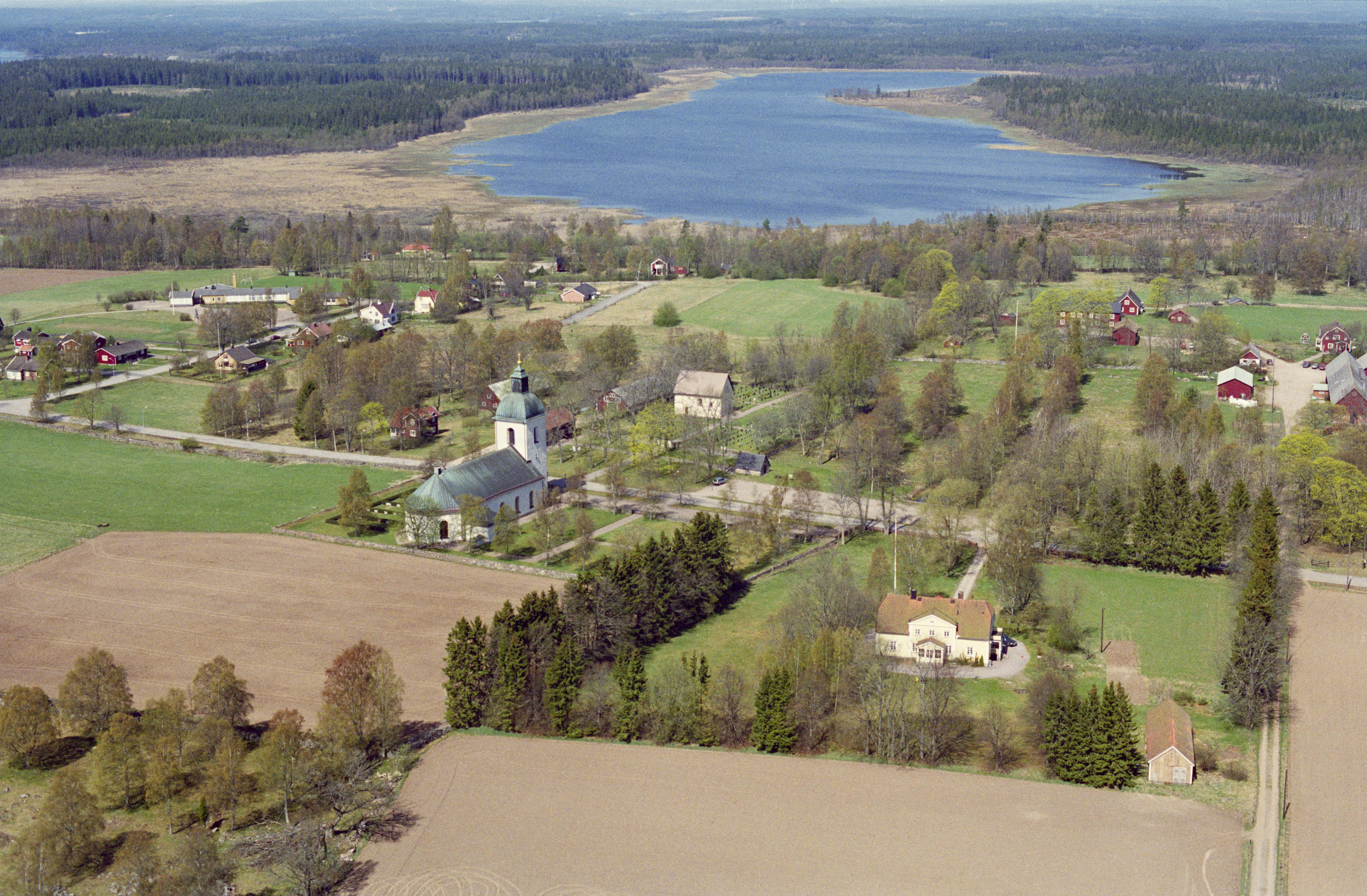 Beskrivning: Dädesjö gamla kyrka och Dädesjö nya kyrka. I bildens övre del sjön Dällingen. Bilden är tagen mot (väderstreck): NV