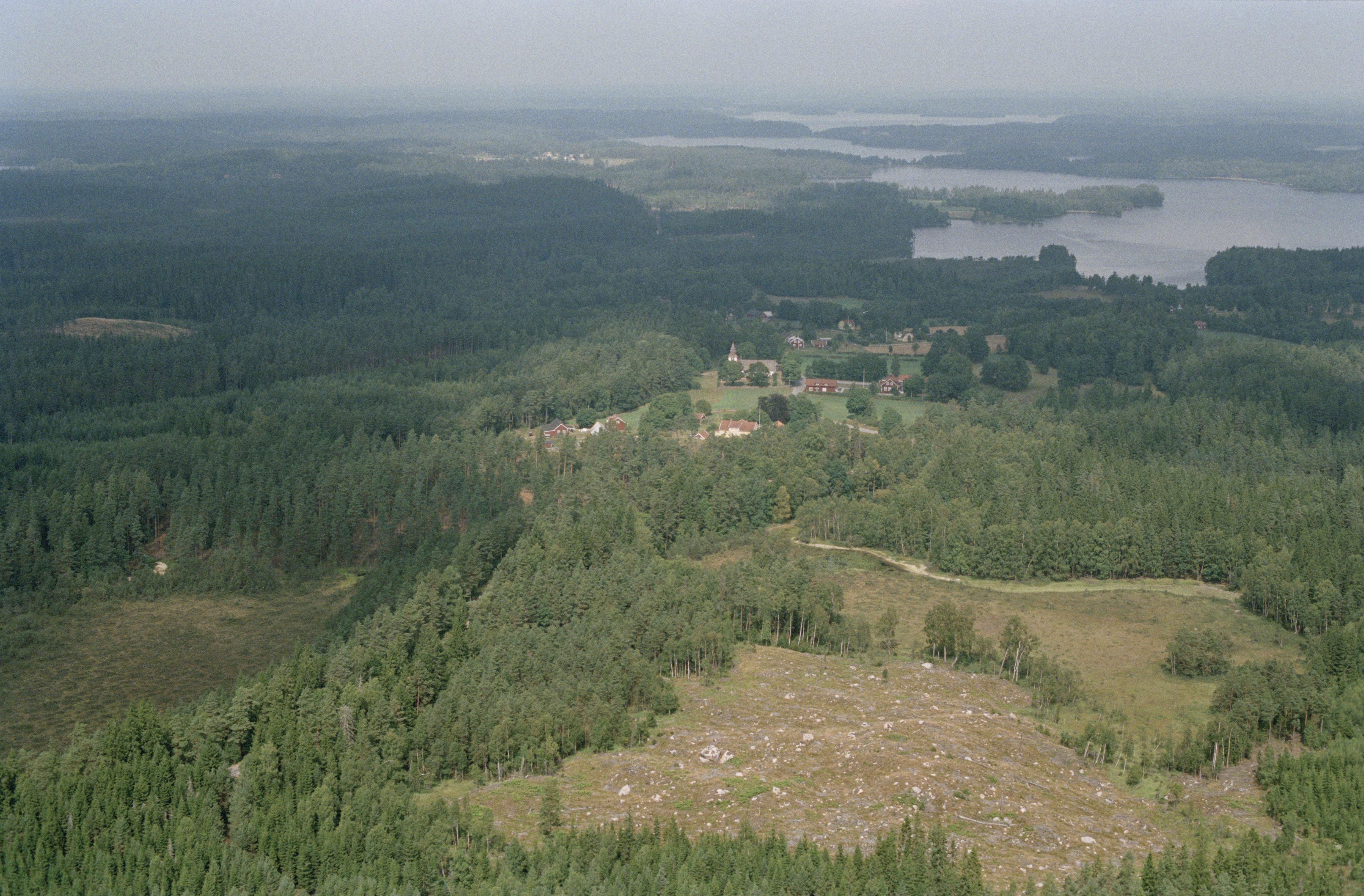 Beskrivning: Femsjö kyrka och kyrkby vid bildens mitt. Uppe till höger sjön Södra Färgen. Bilden är tagen mot (väderstreck): N