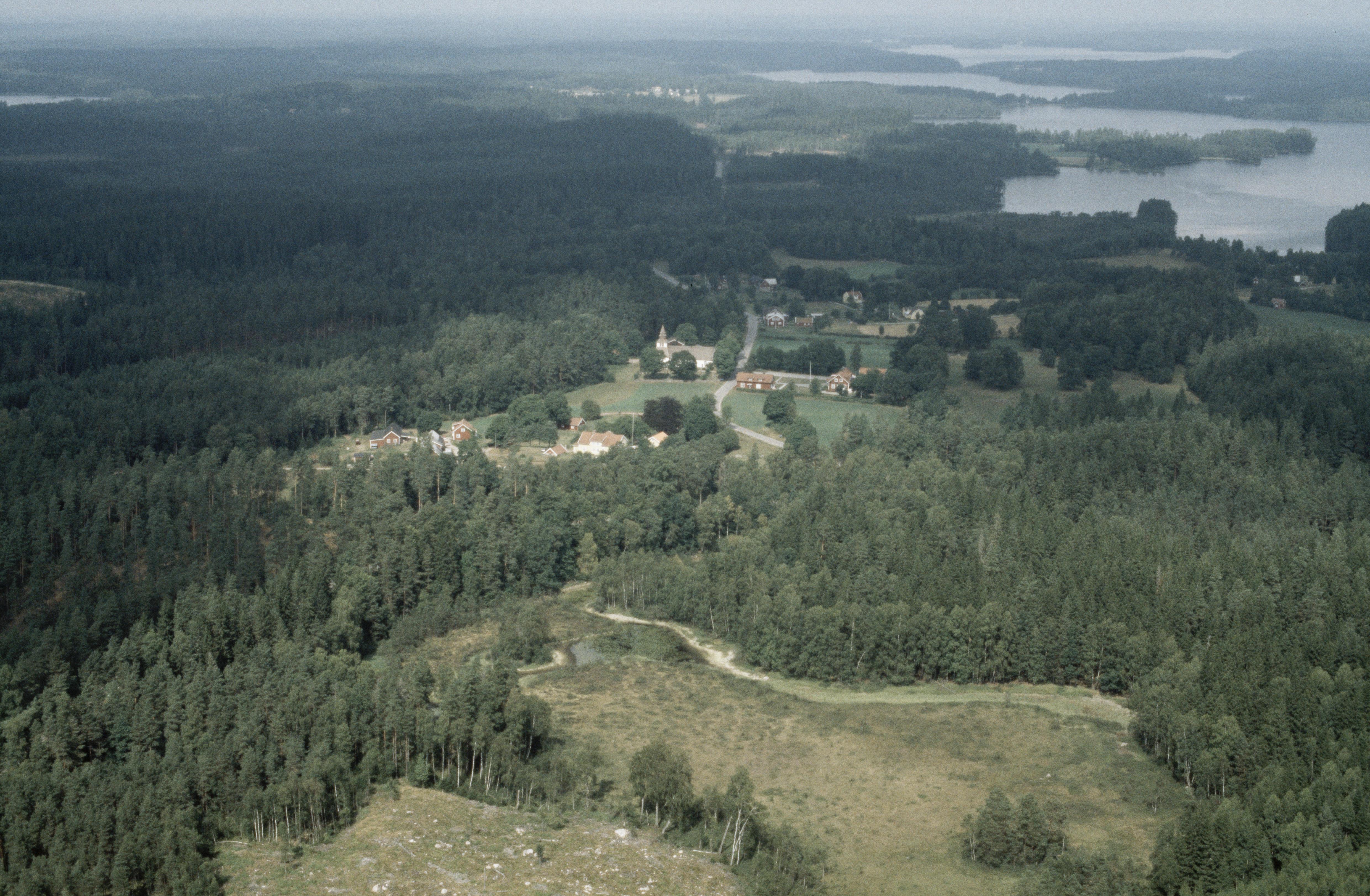 Beskrivning: Femsjö kyrka och kyrkby vid bildens mitt. Uppe till höger sjön Södra Färgen. Bilden är tagen mot (väderstreck): N