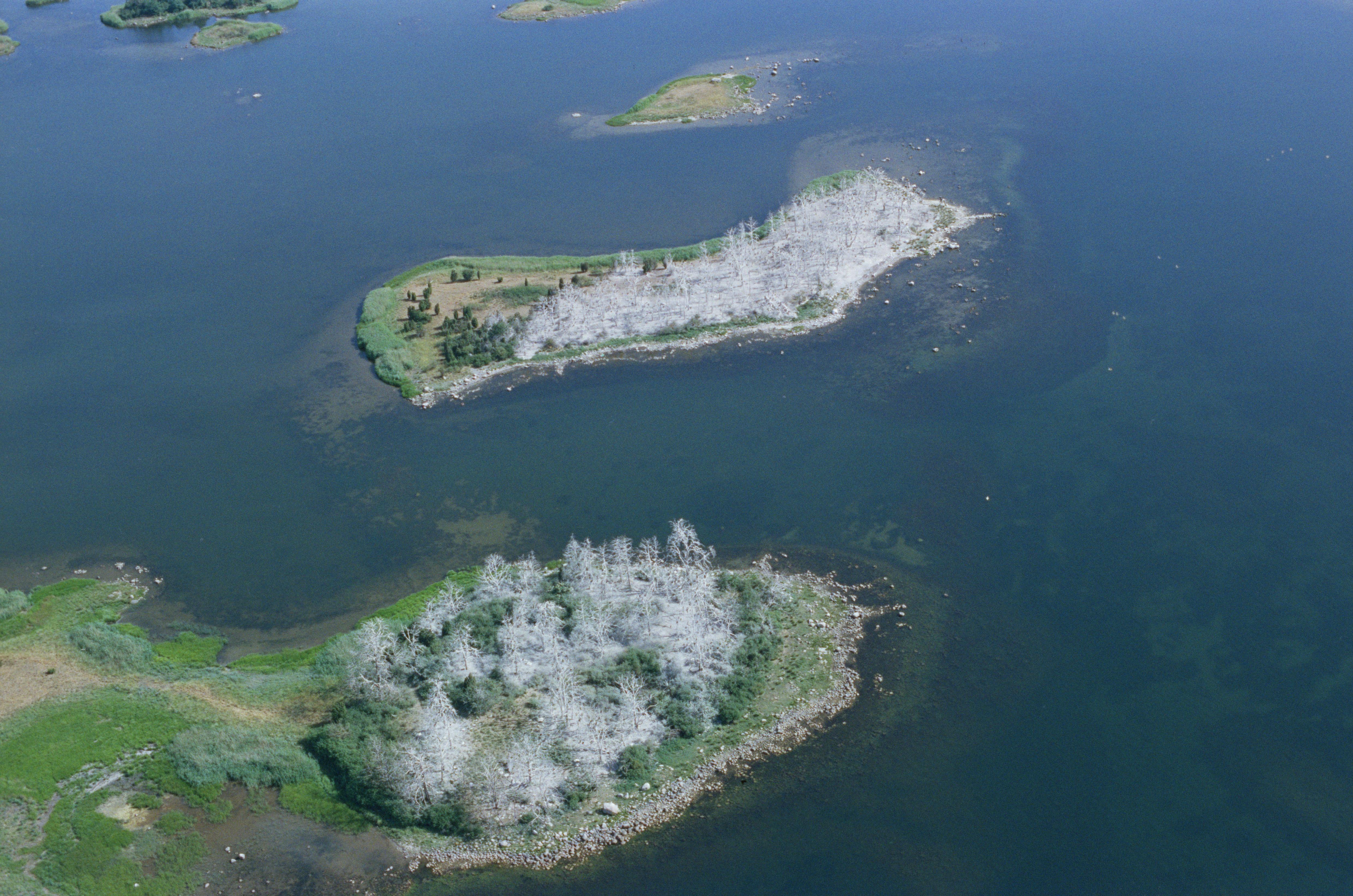 Beskrivning: Skarvkoloni (skarv/skarvar/fåglar) på Södra och Norra Sandholmen vid Svartö i Värnanäs skärgård, Kalmarsund. Bilden är tagen mot (väderstreck): NO
