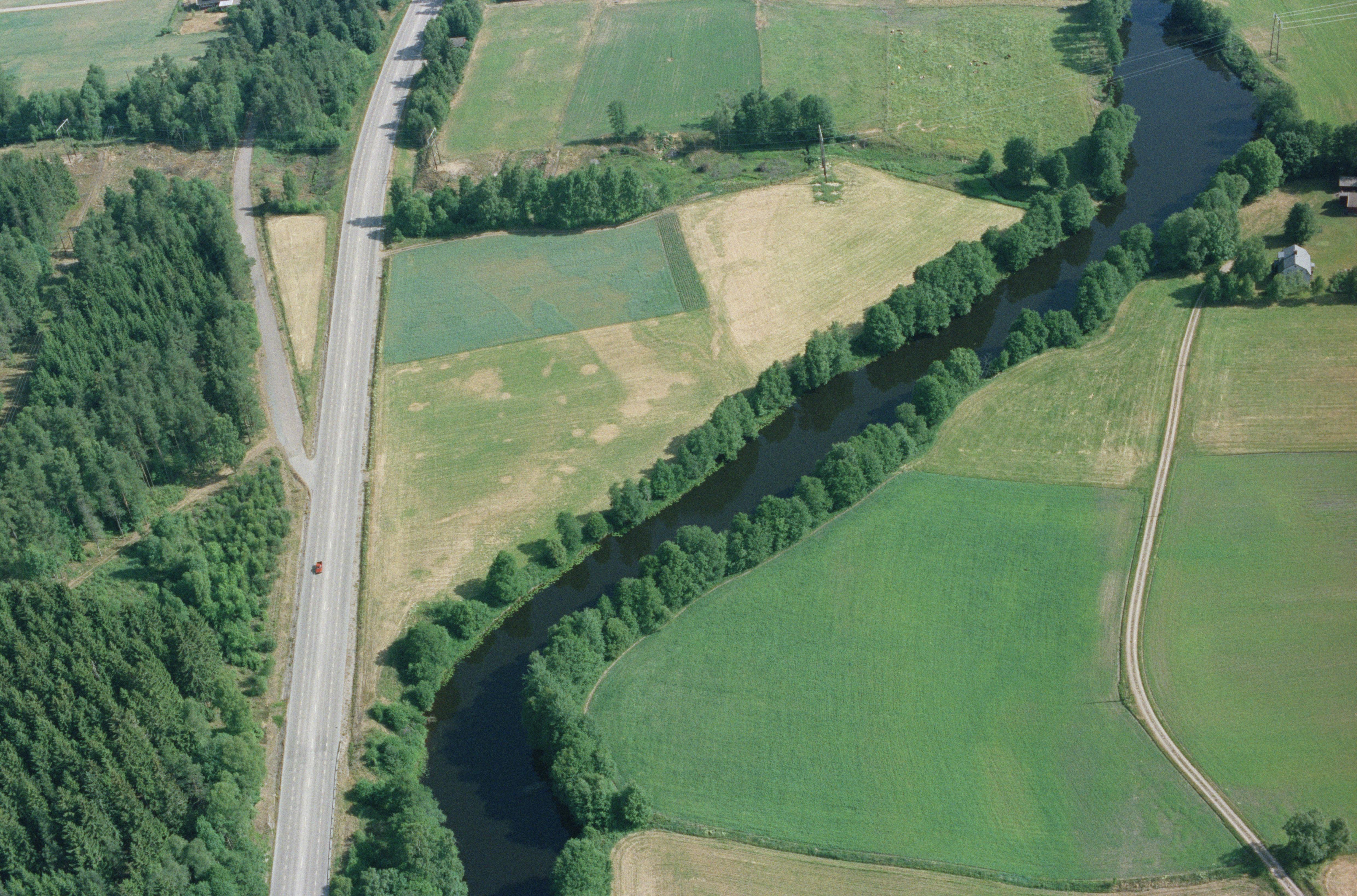 Beskrivning: Ån Lagan vid Fridhem och Bredemad. Vid bildens mitt cropmarks i åker nära fossil åker RAÄnr Kånna 86:1 och bytomt Kånna 59:3. Bilden är tagen mot (väderstreck): N