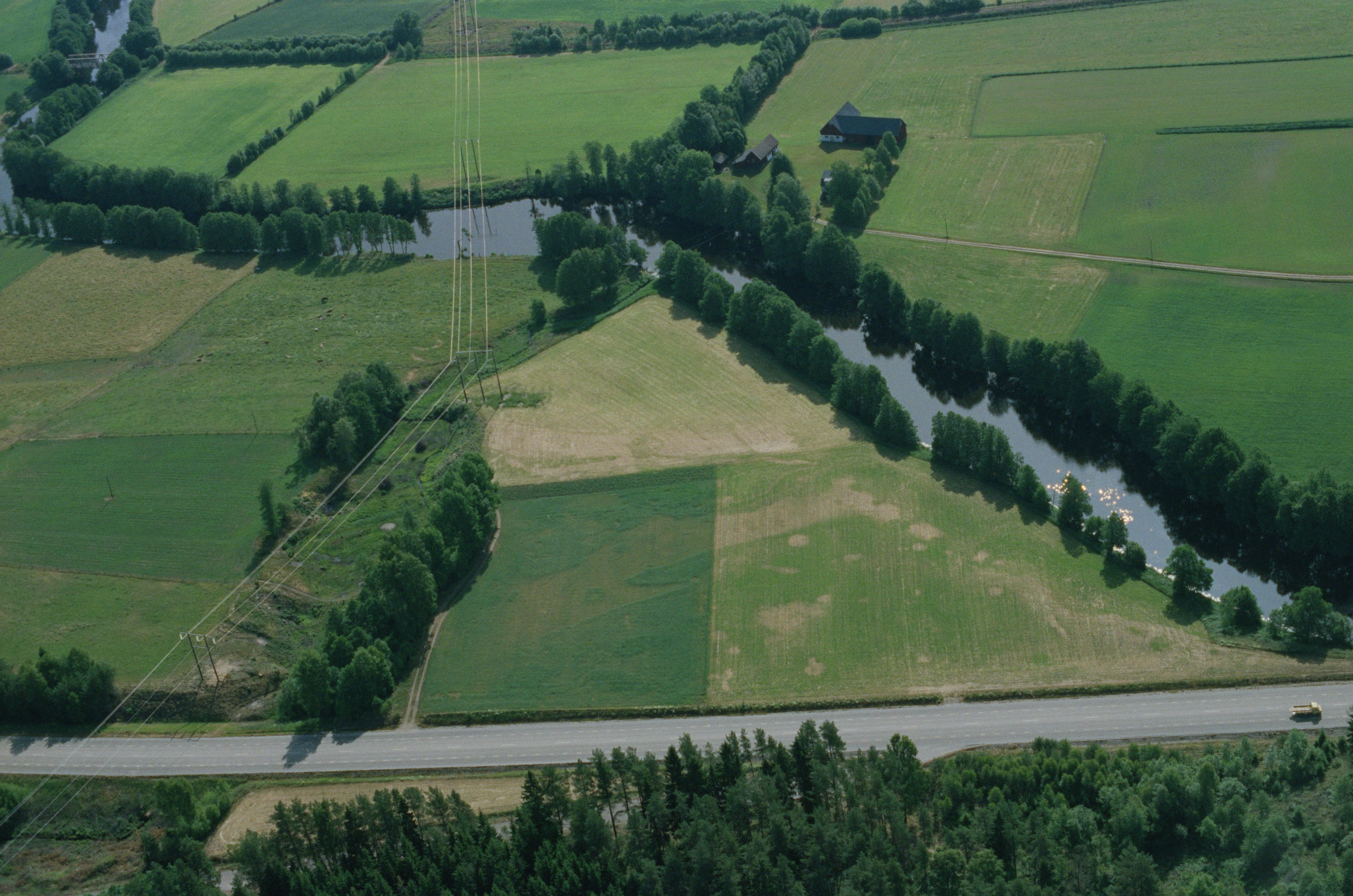 Beskrivning: Ån Lagan vid Fridhem och Bredemad. Vid bildens mitt cropmarks i åker nära fossil åker RAÄnr Kånna 86:1 och bytomt Kånna 59:3. Bilden är tagen mot (väderstreck): Ö