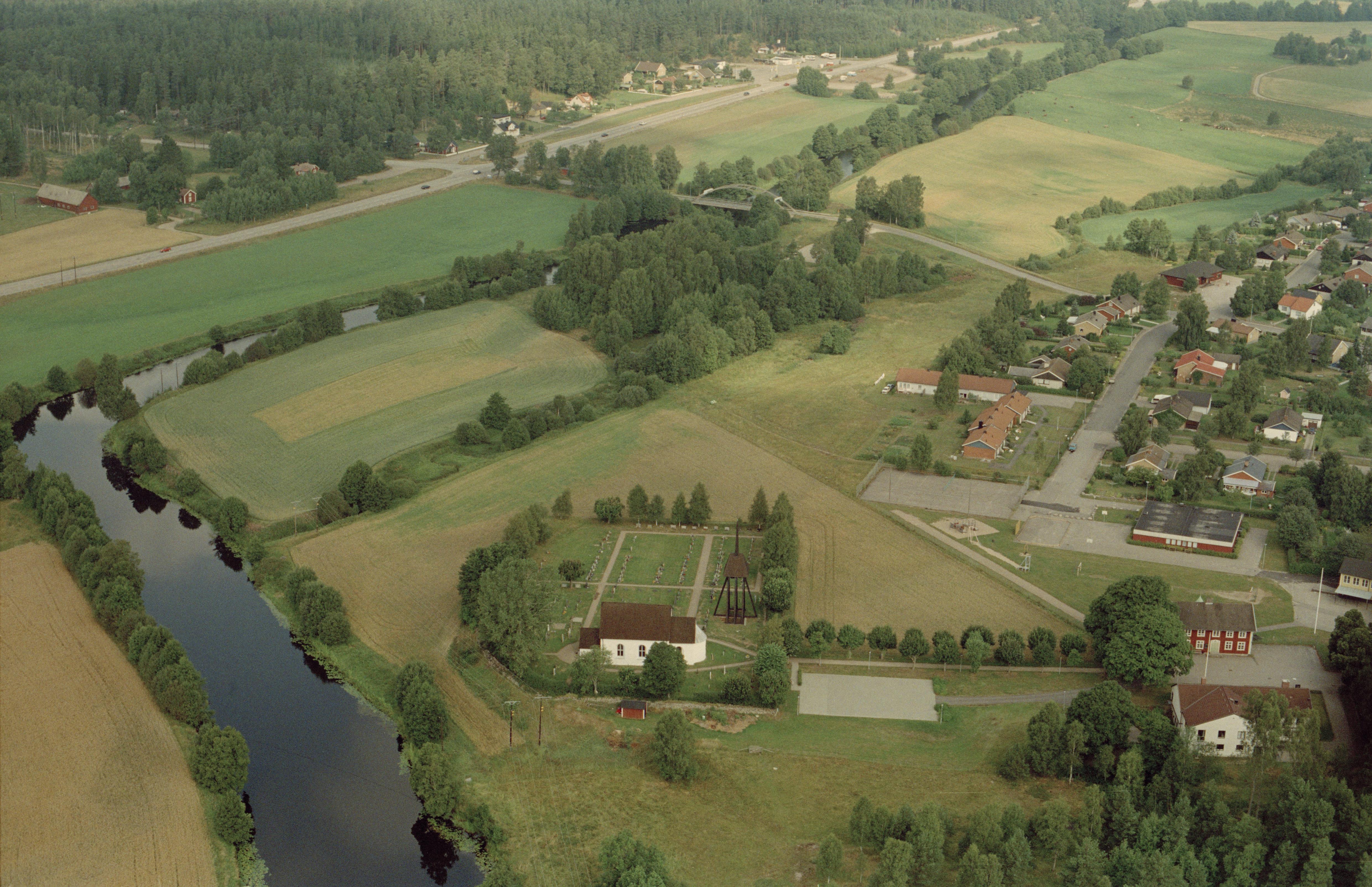 Beskrivning: Ån Lagan vid Kånna tätort. Kånna kyrka under bildens mitt. Bilden är tagen mot (väderstreck): N